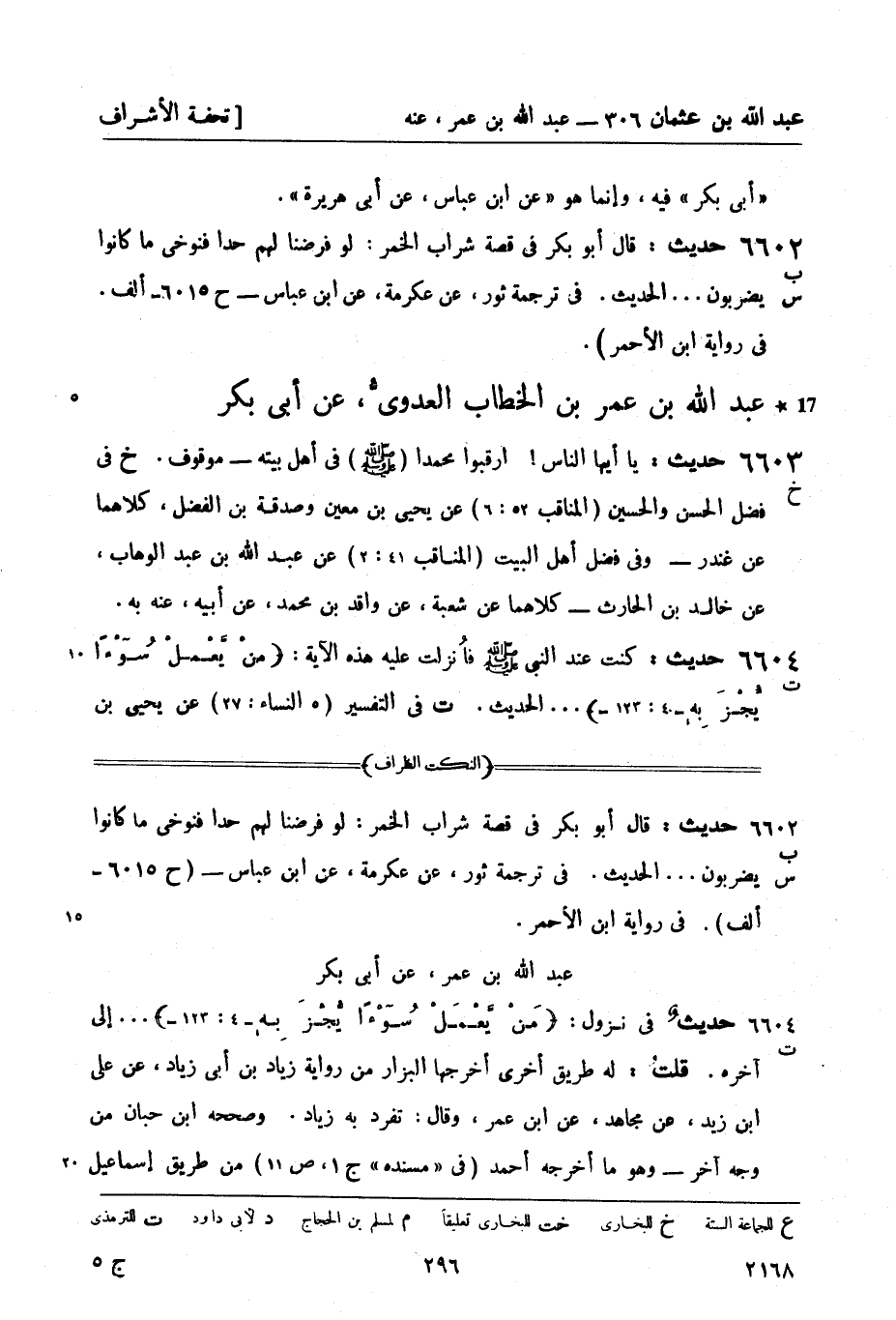 6602 - (ب س) حديث: قال أبو بكر في قصة شراب الخمر: لو فرضنا لهم حداً فنوخي ما كانوا يضربون ... الحديث. في ترجمة ثور، عن عكرمة، عن ابن عباس - ح 6015 - ألف. في رواية ابن الأحمر)