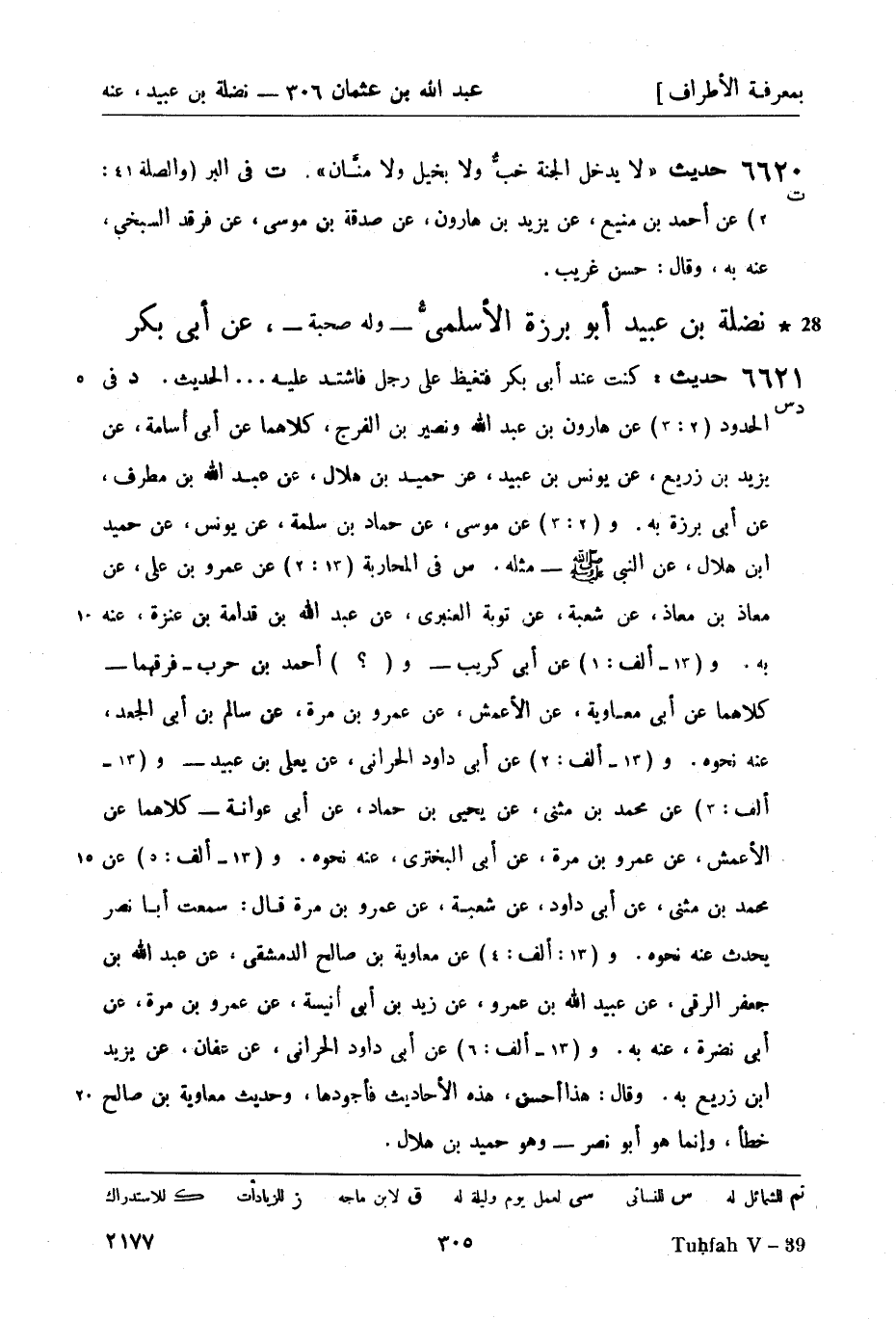 س في المحاربة (13: 2) عن عمرو بن علي، عن معاذ بن معاذ، عن شعبة، عن توبة العنبري، عن عبد الله بن قدامة بن عنزة، عنه به. و (13 - ألف: 1) عن أبي كريب - و (؟) أحمد بن حرب - فرقهما - كلاهما عن أبي معاوية، عن الأعمش، عن عمرو بن مرة، عن سالم بن أبي الجعد، عنه نحوه. و (13 - ألف: 2) عن أبي داود الحراني، عن يعلى بن عبيد - و (13 - ألف: 3) عن محمد بن مثنى، عن يحيى بن حماد، عن أبي عوانة - كلاهما عن الأعمش، عن عمرو بن مرة، عن أبي البختري، عنه نحوه. و (13 - ألف: 5) عن محمد بن مثنى، عن أبي داود، عن شعبة، عن عمرو بن مرة، قال: سمعت أبا نصر يحدث عنه نحوه. و (13: ألف: 4) عن معاوية بن صالح الدمشقي، عن عبد الله بن جعفر الرقي، عن عبيد الله بن عمرو، عن زيد بن أبي أُنيسة، عن عمرو بن مرة، عن أبي نضرة، عنه به و (13 - ألف: 6) عن أبي داود الحراني، عن عفان، عن يزيد بن زريع به. وقال: هذا حسن، هذه الأحاديث فأجودها، وحديث معاوية بن صالح خطأ، وإنما هو أبو نصر - وهو حميد بن هلال.