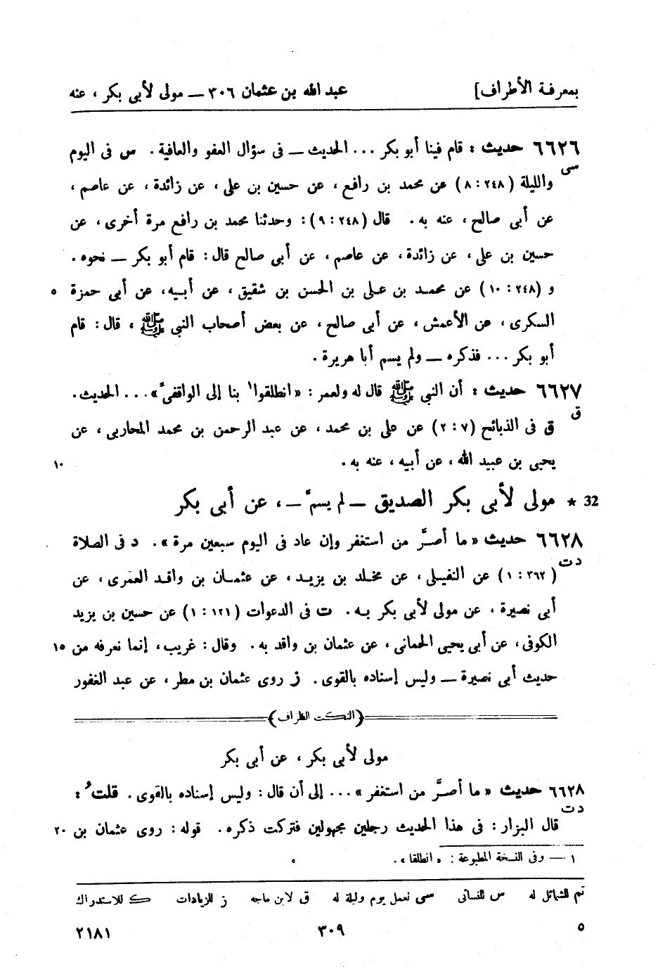 6628 -[د ت] حديث ما أصَّر من استغفر وإن عاد في اليوم سبعين مرة (د) في الصلاة (362: 1) عن النفيلي، عن مخلد بن يزيد، عن عثمان بن واقد العمري، عن أبي نصيرة، عن مولى لأبي بكر به.