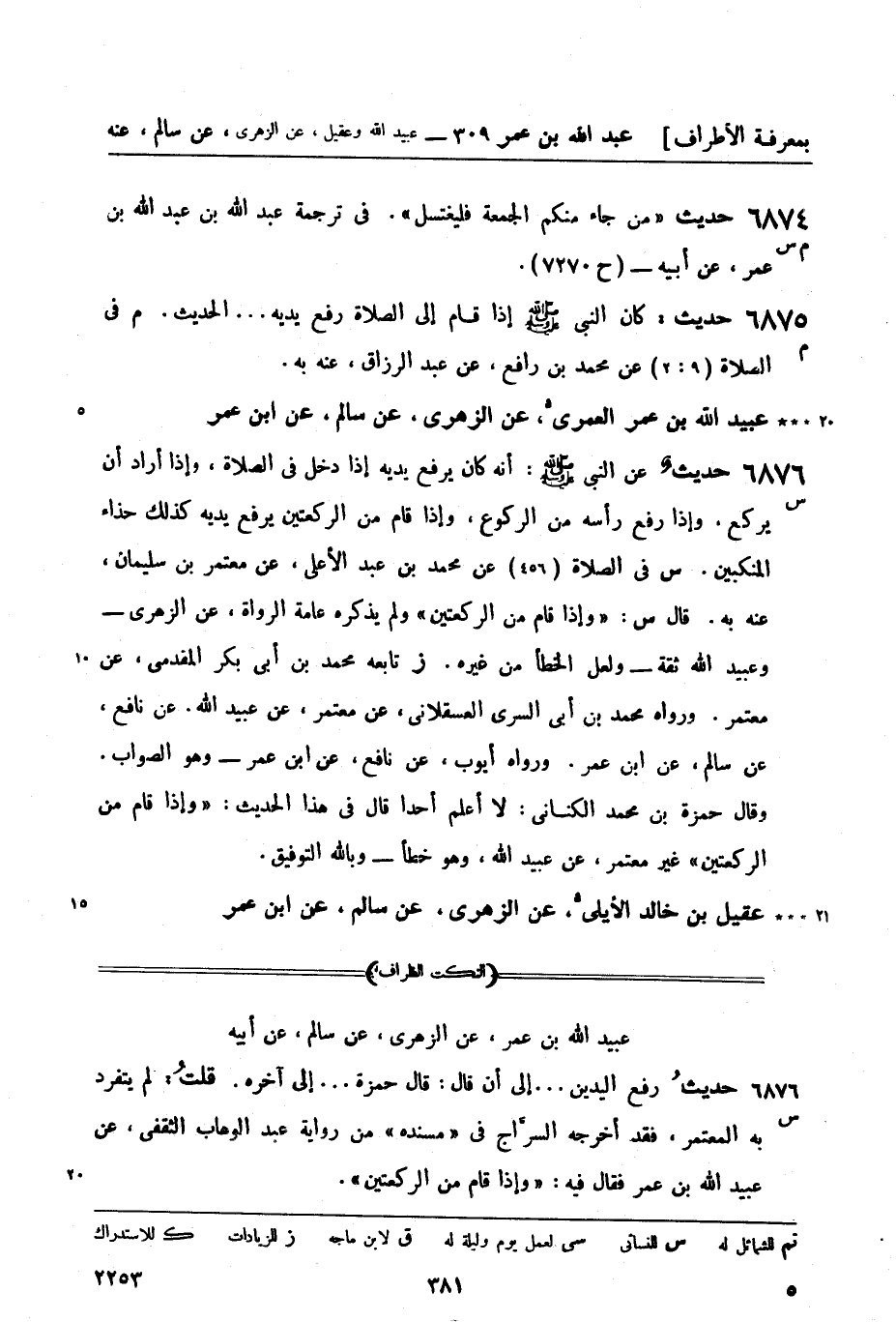 6876 -[س] حديث عن النبيّ صَلَّى اللَّهُ عَلَيْهِ وَسَلَّمَ: أنه كان يرفع يديه إذا دخل في الصلاة، وإذا أراد أن يركع، وإذا رفع رأسه من الركوع، وإذا قام من الركعتين يرفع يديه كذلك حذاء المنكبين س في الصلاة (456) عن محمد بن عبد الأعلى، عن معتمر بن سليمان، عنه به. قال س وإذا قام من الركعتين ولم يذكره عامة الرواة، عن الزهري - وعبيد الله ثقة - ولعل الخطأ من غيره. ز تابعه محمد بن أبي بكر المقدمي، عن معتمر ورواه محمد بن أبي السري العسقلاني، عن معتمر، عن عبيد الله، عن نافع، عن سالم، عن ابن عمر. ورواه أيوب، عن نافع، عن ابن عمر - وهو الصواب. وقال حمزة بن محمد الكناني: لا أعلم أحداً قال في هذا الحديث: وإذا قام من الركعتين غير معتمر، عن عبيد الله، وهو خطأ - وبالله التوفيق.