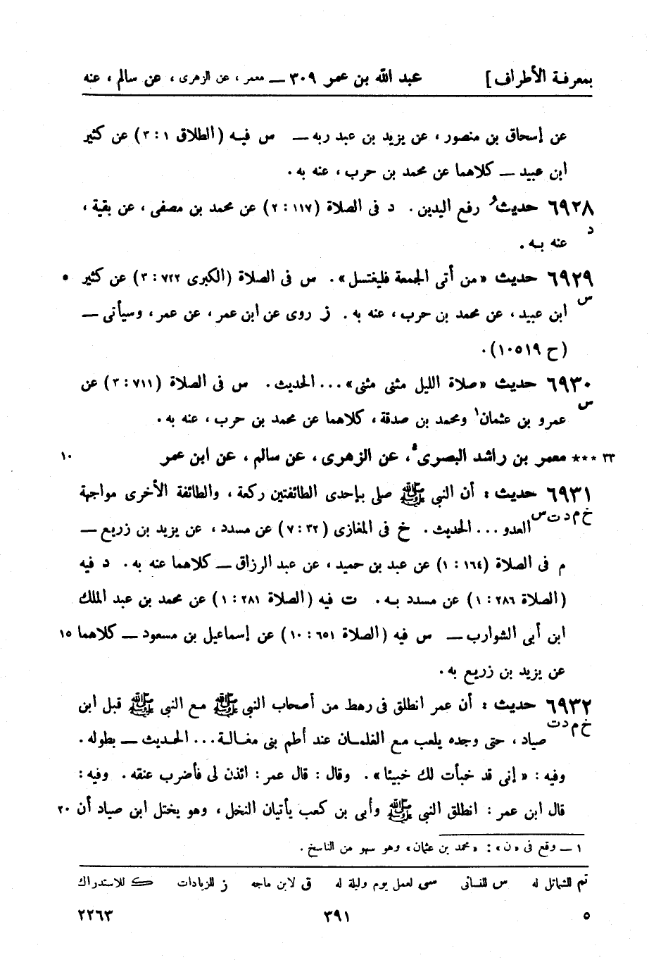 6932 -[خ م د ت] حديث: أن عمر انطلق في رهط من أصحاب النبي صَلَّى اللَّهُ عَلَيْهِ وَسَلَّمَ مع النبي صَلَّى اللَّهُ عَلَيْهِ وَسَلَّمَ قبل ابن صياد حتى وجده يلعب مع الغلمان عند أُطم بني مغالة ... الحديث - بطوله وفيه: إني قد خبأت لك خبيئاً وقال: قال عمر ائذن لي فأضرب عنقه وفيه قال ابن عمر انطلق النبي صَلَّى اللَّهُ عَلَيْهِ وَسَلَّمَ وأُبي بن كعب يأتيان النخل وهو يختل ابن صياد أن -[392]- يسمع منه شيئاً وفيه قال ابن عمر ثم قال النبي صَلَّى اللَّهُ عَلَيْهِ وَسَلَّمَ في الناس فأثنى على الله بما هو أهله ثم ذكر الدجال خ في الجهاد (177) عن عبد الله بن محمد عن هشام بن يوسف عنه به قال وقال الليث عن عقيل وفي القدر (14: 2) عن علي بن حفص وبشر بن محمد كلاهما عن عبد الله بن المبارك عنه ببعضه قال لابن صياد خبأت لك خبيئاً وقول عمر: ائذن (لي) فأضرب عنقه. م في الفتن (19: 13) عن سلمة بن شبيب وعبد حميد كلاهما عن عبد الرزاق عنه بمعنى حديث يونس (ح 6990) وصالح (ح 6859) عن الزهري وفيه حديثه عن عمر بن ثابت الأنصاري (15649) ، عن بعض أصحاب النبيّ صَلَّى اللَّهُ عَلَيْهِ وَسَلَّمَ. وليس في حديث عبد بن حميد قصة انطلاق النبي صَلَّى اللَّهُ عَلَيْهِ وَسَلَّمَ مع أُبي بن كعب إلى النخل. د في الملاحم (16: 1) عن أبي عاصم خشيش بن أصرم، عن عبد الرزاق بإسناده ... إلى قوله: فلا خير لك في قتله وفي السنَّة (29: 2) عن مخلد بن خالد عن عبد الرزاق - بالقصة الأخيرة: قام النبي صَلَّى اللَّهُ عَلَيْهِ وَسَلَّمَ في الناس ت في الفتن (56: 1، و63: 4) عن عبد بن حميد به - مقطعاً في موضعين وفي آخره حديث عمر بن ثابت الأنصاري (ح 15649) - وليس فيه قصة انطلاق النبي صَلَّى اللَّهُ عَلَيْهِ وَسَلَّمَ مع أُبي بن كعب إلى النخل وقال صحيح