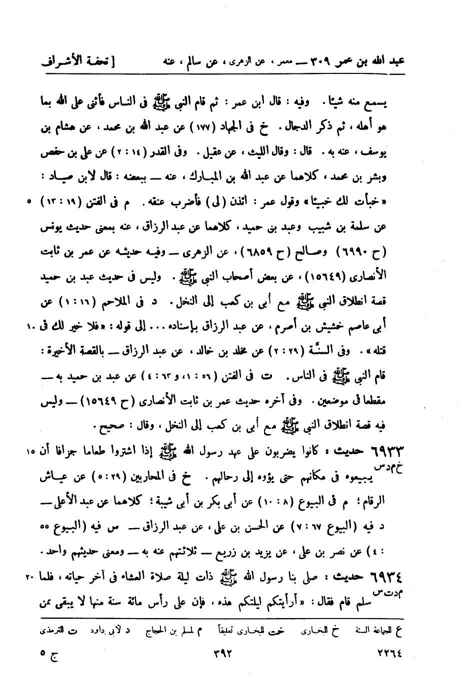 6934 -[م د ت س] حديث: صلى بنا رسول الله صَلَّى اللَّهُ عَلَيْهِ وَسَلَّمَ ذات ليلة صلاة العشاء في آخر حياته فلما سلم قام فقال أرأيتكم ليلتكم هذه، فإن على رأس مائة سنة منها لا يبقى ممن -[393]- هو على ظهر الأرض أحد ... (الحديث) . م في الفضائل (99: 1) عن محمد بن رافع - وعبد بن حميد - د في الملاحم (18: 1) عن أحمد بن حنبل - ت في الفتن (64: 2) عن عبد بن حميد - س في الصلاة (الكبرى؟) وفي العلم (الكبرى 20) عن نوح بن حبيب - أربعتهم عن عبد الرزاق، عن معمر عن الزهري عن سالم وأبي بكر بن سليمان بن أبي حثمة (ح 7578) كلاهما عن ابن عمر به، وقال ت: حسن صحيح