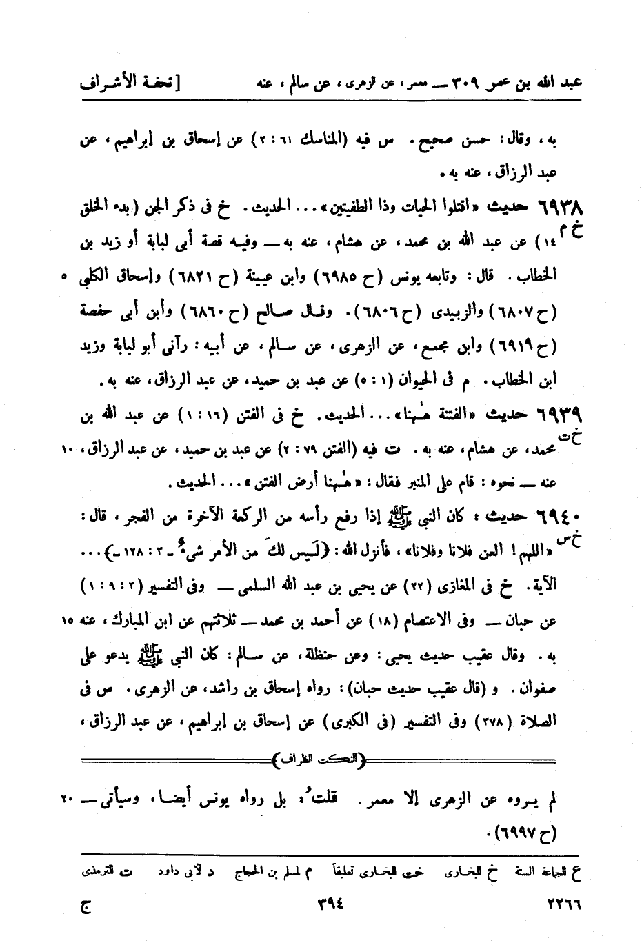 6940 -[خ س] حديث: كان النبي صَلَّى اللَّهُ عَلَيْهِ وَسَلَّمَ إذا رفع رأسه من الركعة الآخرة من الفجر قال اللهم العن فلاناً وفلاناً فأنزل الله لَيس لكَ من الأمر شيءٌ ... (3: 128) الآية خ في المغازي (22) عن يحيى بن عبد الله السلمي - وفي التفسير (3: 9: 1) عن حبان - وفي الاعتصام (18) عن أحمد بن محمد - ثلاثتهم عن ابن المبارك، عنه به. وقال عقيب حديث يحيى: وعن حنظلة عن سالم: كان النبي صَلَّى اللَّهُ عَلَيْهِ وَسَلَّمَ يدعو على صفوان. و (قال عقيب حديث حبان) : رواه إسحاق بن راشد عن الزهري س في الصلاة (378) وفي التفسير (في الكبرى) عن إسحاق بن إبراهيم، عن عبد الرزاق، -[395]- عنه به. وفي التفسير (في الكبرى) عن عمرو بن يحيى بن الحارث، عن محبوب بن موسى، عن ابن المبارك به.
