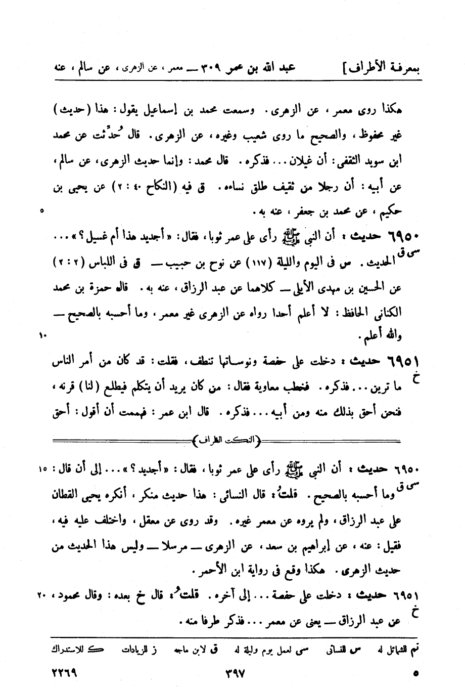 6951 -[خ] حديث: دخلت على حفصة ونوساتها تنطف، فقلت: قد كان من أمر الناس ما ترين ... فذكره. فخطب معاوية فقال: من كان يريد أن يتكلم فيطلع (لنا) قرنه، فنحن أحق بذلك منه ومن أبيه ... فذكره. قال ابن عمر: فهممت أن أقول: أحق -[398]- بهذا الأمر (منك) من قاتلك وأباك على الإسلام ... (الحديث) خ في المغازي (30: 12) عن إبراهيم بن موسى عن هشام عن معمر عن الزهري عن سالم عن أبيه وعن ابن طاوس عن عكرمة بن خالد عن ابن عمر به - (ح 7346) . (وقال بعده: قال محمود، عن عبد الرزاق: ونوساتها)