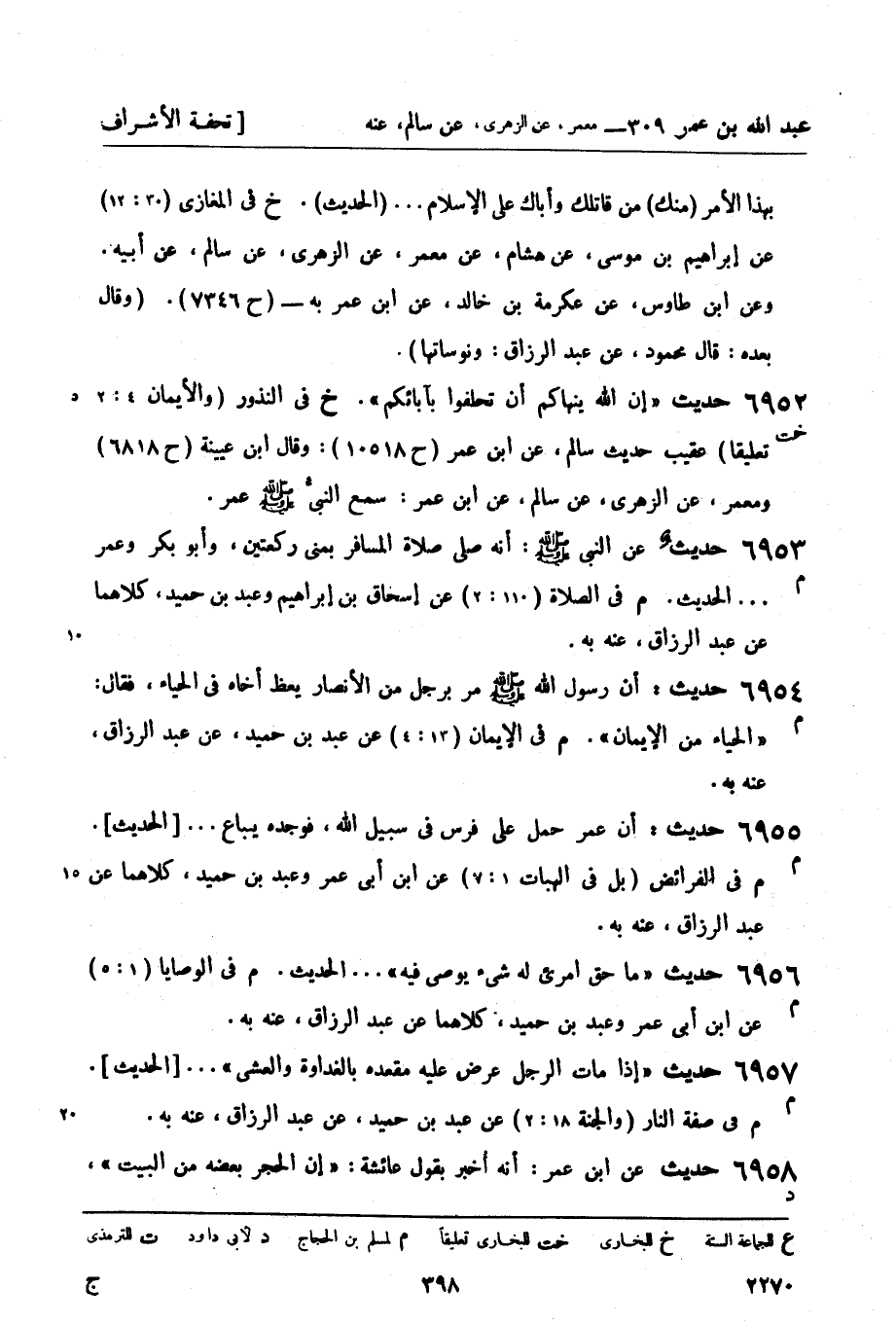 6952 -[خت] حديث إن الله ينهاكم أن تحلفوا بآبائكم خ في النذور (والأيمان 4: 2 تعليقاً) عقيب حديث سالم، عن ابن عمر (ح 10518) وقال ابن عيينة (ح 6818) ومعمر، عن الزهري عن سالم عن ابن عمر سمع النبيُّ صَلَّى اللَّهُ عَلَيْهِ وَسَلَّمَ عمر