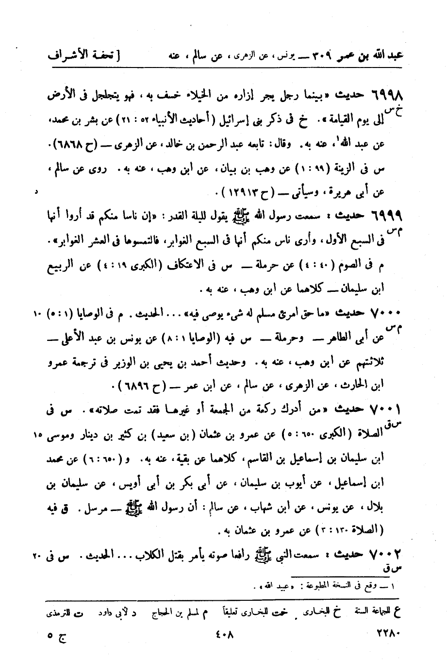 6998 -[خ س] حديث بينما رجل يجر إزاره من الخيلاء خسف به فهو يتجلجل في الأرض إلى يوم القيامة. خ في ذكر بني إسرائيل (أحاديث الأنبياء 52: 21) عن بشر بن محمد، عن عبد الله، عنه به. وقال: تابعه عبد الرحمن بن خالد، عن الزهري - (ح 6868) س في الزينة (99: 1) عن وهب بن بيان، عن ابن وهب، عنه به. روى عن سالم عن أبي هرية وسيأتي - (ح 12913)