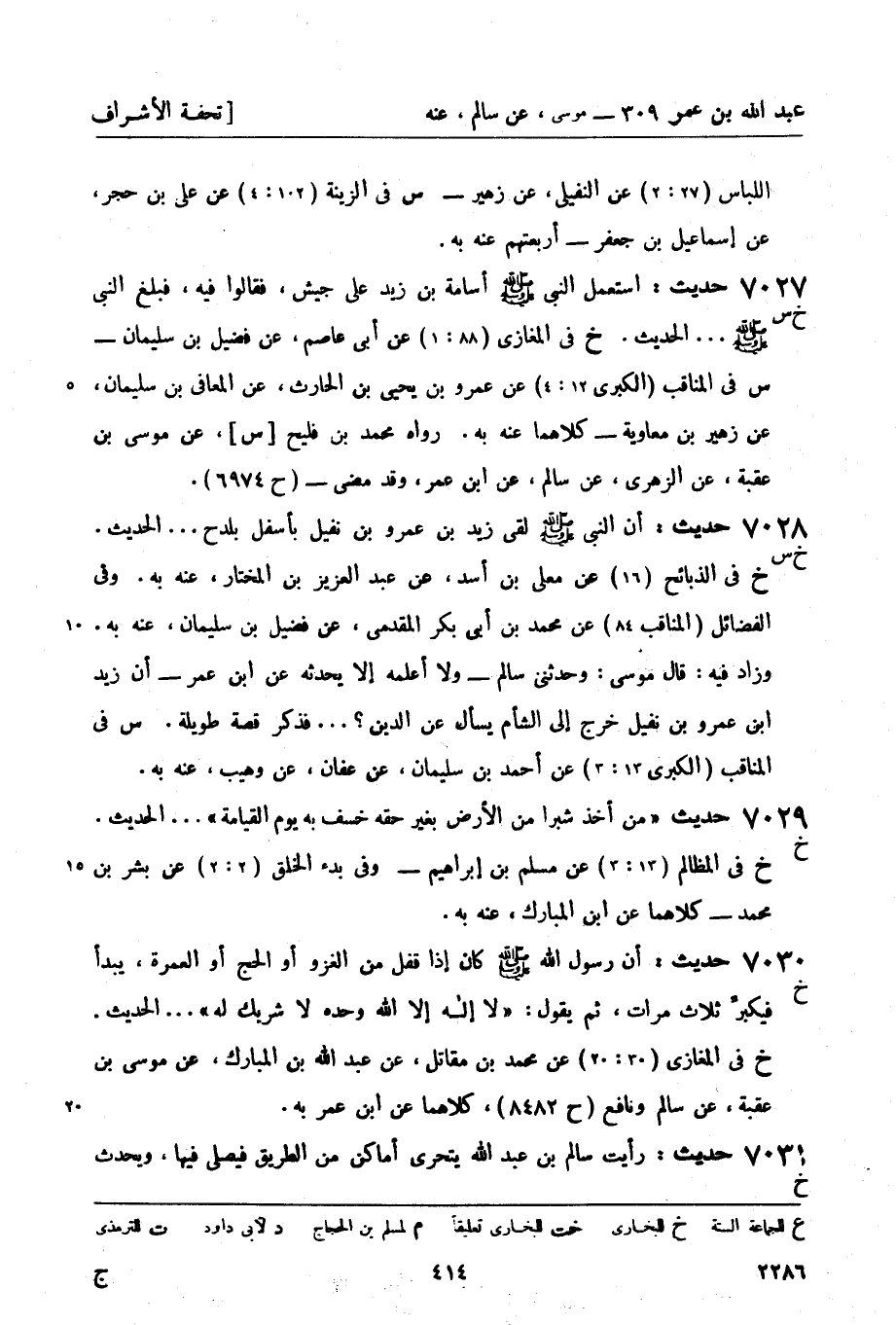 7028 -[خ س] حديث: أن النبي صَلَّى اللَّهُ عَلَيْهِ وَسَلَّمَ لقي زيد بن عمرو بن نفيل بأسفل بلدح ... الحديث خ في الذبائح (16) عن معلى بن أسد عن عبد العزيز بن المختار عنه به وفي الفضائل (المناقب 84) عن محمد بن أبي بكر المقدمي عن فضيل بن سليمان عنه به. وزاد فيه: قال موسى: وحدثني سالم - ولا أعلمه إلا يحدثه عن ابن عمر - أن زيد بن عمرو بن نفيل خرج إلى الشأم يسأل عن الدين؟ ... فذكر قصة طويلة. س في المناقب (الكبرى 13: 3) عن أحمد بن سليمان عن عفان عن وهيب عنه به