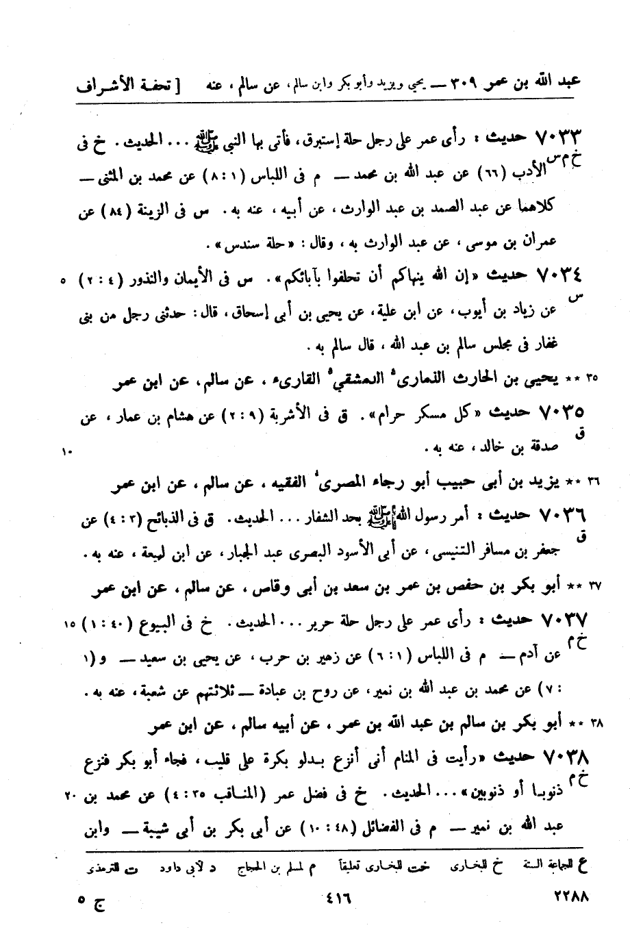 7037 -[خ م] حديث: رأى عمر على رجل حلة حرير ... الحديث. خ في البيوع (40: 1) عن آدم - م في اللباس (1: 6) عن زهير بن حرب، عن يحيى بن سعيد - و (1: 7) عن محمد بن عبد الله بن نمير، عن روح بن عبادة - ثلاثتهم عن شعبة، عنه به