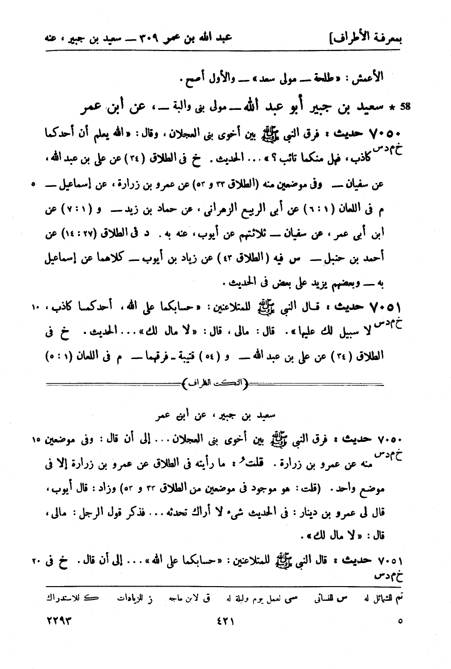 7050 -[خ م د س] حديث: فرق النبي صَلَّى اللَّهُ عَلَيْهِ وَسَلَّمَ بين أخوي بني العجلان وقال: الله يعلم أن أحدكما كاذب فهل منكما تائب؟ ... الحديث خ في الطلاق (34) عن علي بن عبد الله عن سفيان - وفي موضعين منه (الطلاق 33 و53) عن عمرو بن زرارة عن إسماعيل - م في اللعان (1: 6) عن أبي الربيع الزهراني، عن حماد بن زيد - و (1: 7) عن ابن أبي عمر عن سفيان - ثلاثتهم عن أيوب، عنه به. د في الطلاق (27: 14) عن أحمد بن حنبل - س فيه (الطلاق 43) عن زياد بن أيوب - كلاهما عن إسماعيل به - وبعضهم يزيد على بعض في الحديث