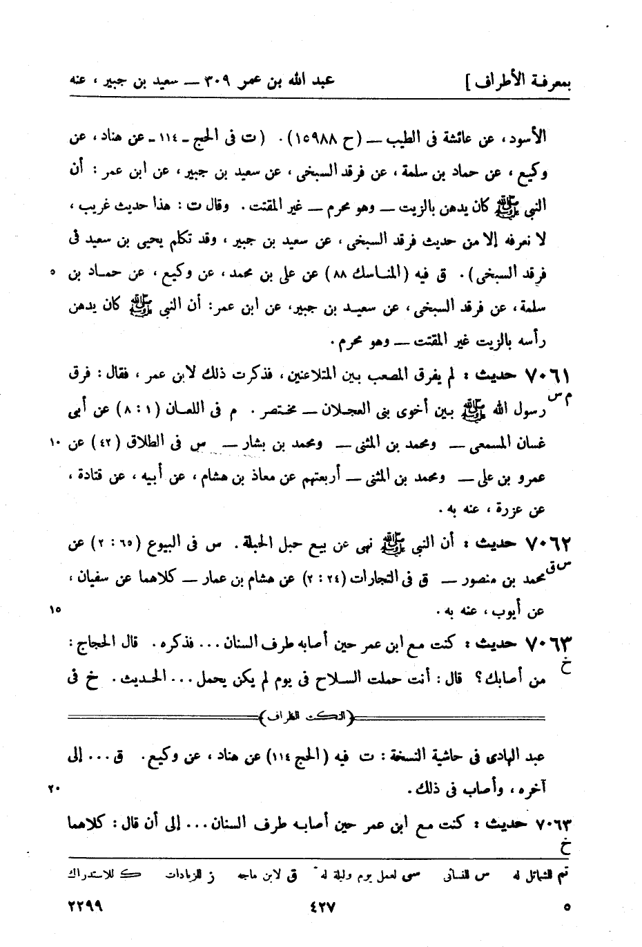 7063 -[خ] حديث: كنت مع ابن عمر حين أصابه طرف السنان ... فذكره قال الحجاج: من أصابك؟ قال أنت حملت السلاح في يوم لم يكن يحمل ... الحديث خ في -[428]- العيدين (؟) عن أحمد بن يعقوب عن إسحاق بن سعيد - و (الصلاة 373: 1) عن أبي السكين زكريا بن يحيى عن المحاربي - كلاهما عن محمد بن سوقة عنه به