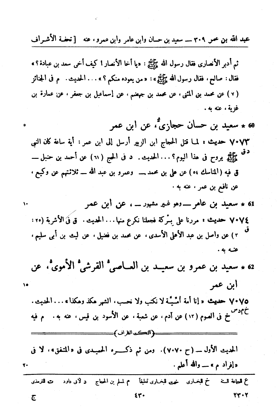 7075 -[خ م د س] حديث إنا أمة أُمِّيَّة لا نكتب ولا نحسب الشهر هكذا وهكذا ... الحديث خ في الصوم (13) عن آدم عن شعبة عن الأسود بن قيس عنه به م فيه -[431]- (الصيام 2: 14) عن أبي بكر بن أبي شيبة وابن مثنى وابن بشار ثلاثتهم عن غندر عن شعبة به. و (2: 14) عن محمد بن حاتم عن ابن مهدي عن سفيان عن الأسود بن قيس به. د فيه (الصوم 4: 1) عن سليمان بن حرب، عن شعبة به. س فيه (الصيام 8 - ج: 3) عن محمد بن المثنى عن ابن مهدي به وفيه (الصيام 8 - ج: 4) وفي العلم (الكبرى 30: 2) عن ابن مثنى وابن بشار كلاهما عن غندر به