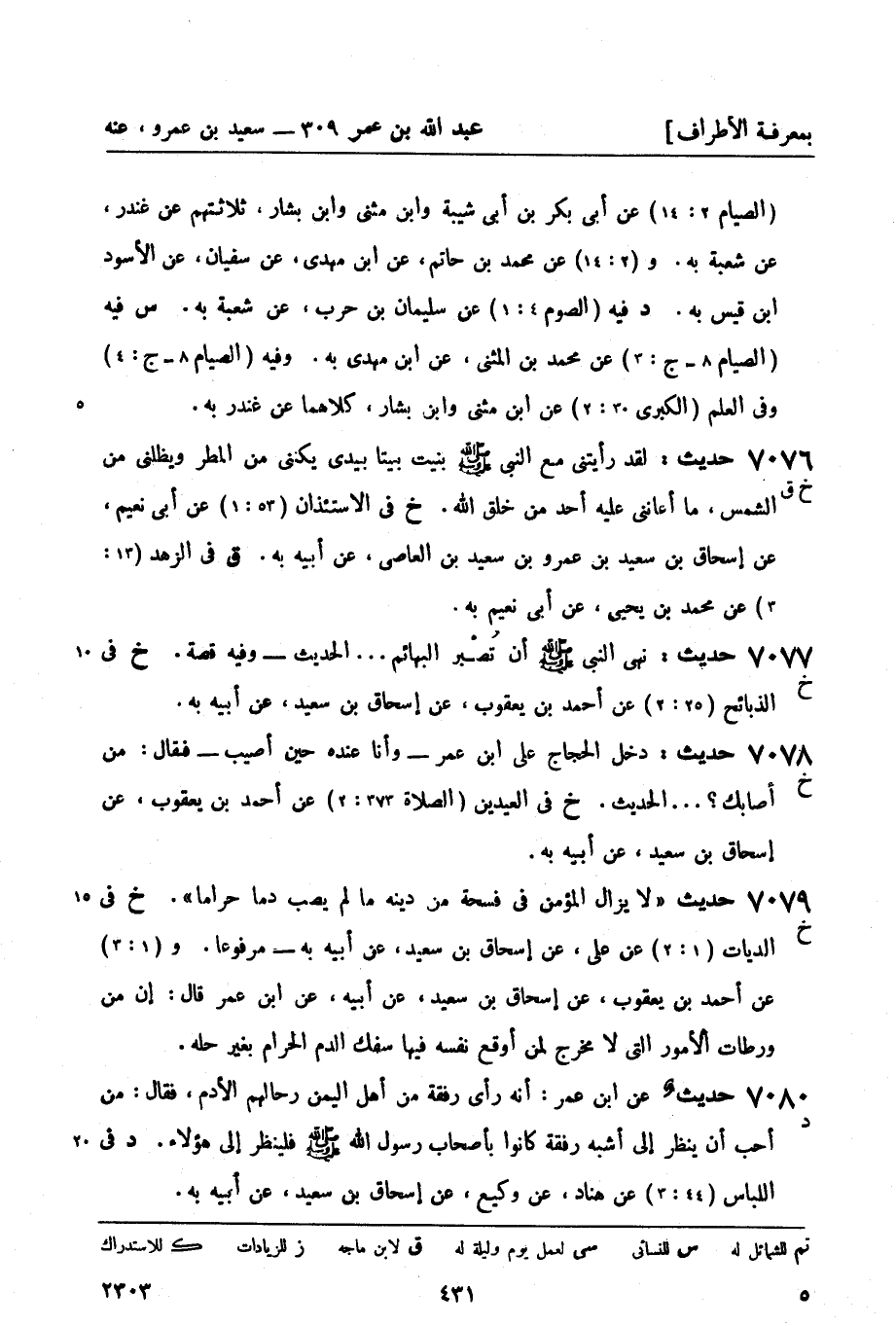 7079 -[خ] حديث لا يزال المؤمن في فسحة من دينه ما لم يصب دماً حراماً خ في الديات (1: 2) عن علي عن إسحاق بن سعيد عن أبيه به - مرفوعاً. و (1: 3) عن أحمد بن يعقوب عن إسحاق بن سعيد عن أبيه عن ابن عمر قال: إن من ورطات الأمور التي لا مخرج لمن أوقع نفسه فيها سفك الدم الحرام بغير حله