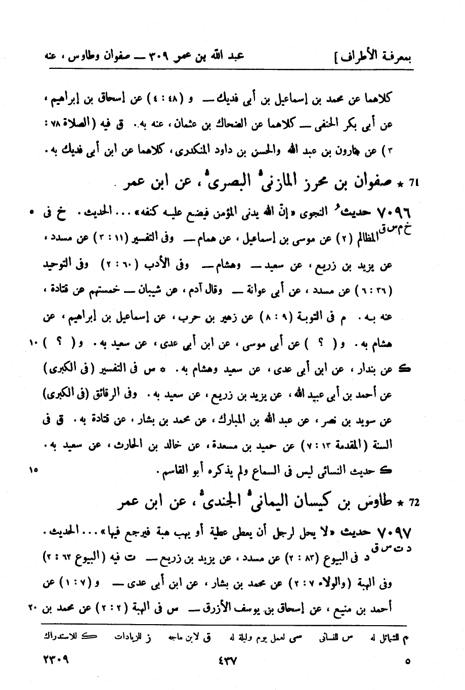 7096 -[خ م س ق] حديث النجوى إنّ الله يدني المؤمن فيضع عليه كنفه ... الحديث خ في المظالم (2) عن موسى بن إسماعيل عن همام - وفي التفسير (11: 3) عن مسدد عن يزيد بن زريع عن سعيد - وهشام - وفي الأدب (60: 2) وفي التوحيد (36: 6) عن مسدد عن أبي عوانة - وقال آدم عن شيبان - خمستهم عن قتادة عنه به م في التوبة (9: 8) عن زهير بن حرب عن إسماعيل بن إبراهيم عن هشام به و (؟) عن أبي موسى عن ابن أبي عدي عن سعيد به و (؟) عن بندار عن ابن أبي عدي عن سعيد وهشام به. ك س في التفسير (في الكبرى) عن أحمد بن أبي عبيد الله عن يزيد بن زريع عن سعيد به وفي الرقائق (في الكبرى) عن سويد بن نصر عن عبد الله بن المبارك عن محمد بن بشار عن قتادة به. ق في السنة (المقدمة 13: 7) عن حميد بن مسعدة عن خالد بن الحارث عن سعيد به. ك حديث النسائي ليس في السماع ولم يذكره أبو القاسم