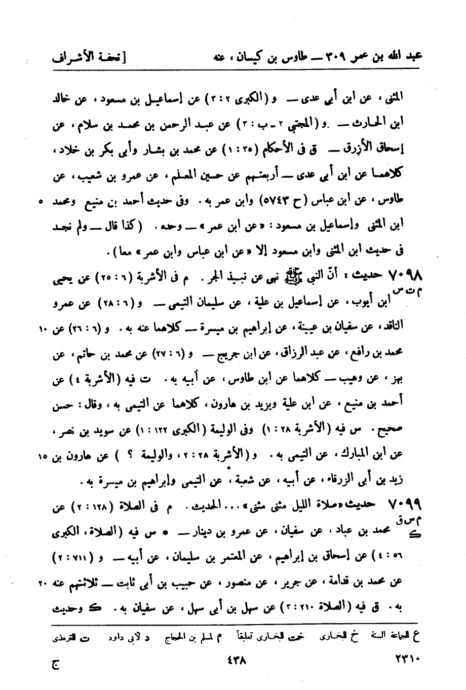 7099 -[م س ق] حديث صلاة الليل مثنى مثنى ... الحديث. م في الصلاة (128: 2) عن محمد بن عباد عن سفيان عن عمرو بن دينار - ك س فيه (الصلاة، الكبرى 56: 4) عن إسحاق بن إبراهيم عن المعتمر بن سليمان عن أبيه - و (711: 2) عن محمد بن قدامة عن جرير عن منصور عن حبيب بن أبي ثابت - ثلاثتهم عنه به ق فيه (الصلاة 210: 3) عن سهل بن أبي سهل عن سفيان به ك وحديث -[439]- إسحاق بن إبراهيم لم يذكره أبو القاسم
