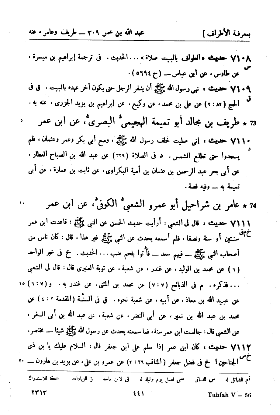 7112 -[خ س] حديث: كان ابن عمر إذا سلم على ابن جعفر قال: السلام عليك يا ابن ذي الجناحين خ في فضل جعفر (المناقب 39: 2) عن عمرو بن علي عن يزيد بن هارون -[442]- وفي المغازي (45: 4) عن محمد بن أبي بكر المقدمي عن عمه عمر بن علي كلاهما عن إسماعيل بن أبي خالد عنه به. س في المناقب (الكبرى 6: 2) عن أحمد بن سليمان عن يزيد بن هارون به