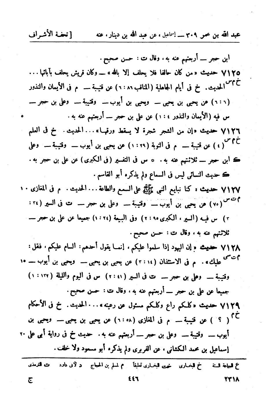 7129 -[خ م] حديث كلكم راع وكلكم مسئول عن رعيته ... الحديث خ في الأحكام (؟) عن قتيبة - م في المغازي (58: 6) عن يحيى بن يحيى - ويحيى بن أيوب - وقتيبة - وعلي بن حجر - أربعتهم عنه به حديث خ في رواية أبي علي إسماعيل بن محمد الكشاني عن الفربري ولم يذكره أبو مسعود ولا خلف