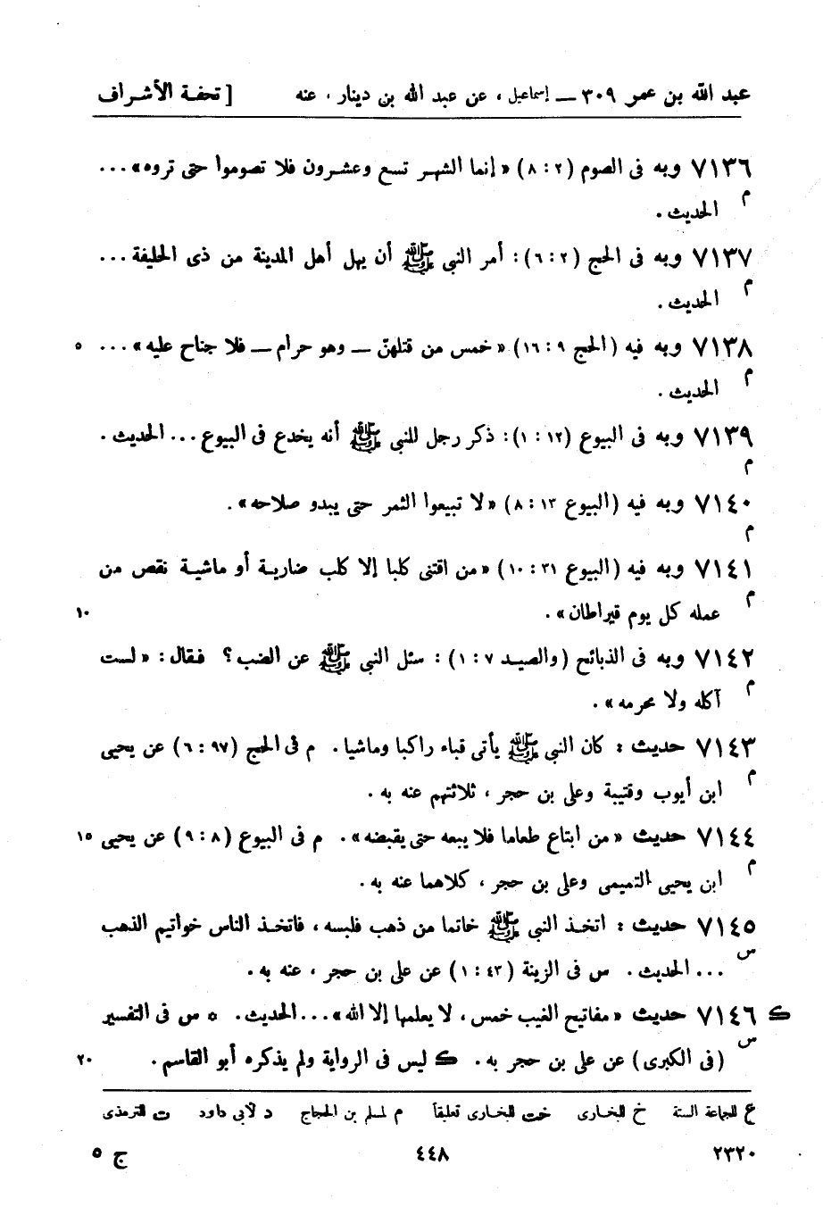 7143 -[م] حديث: كان النبي صَلَّى اللَّهُ عَلَيْهِ وَسَلَّمَ يأتي قباء راكباً وماشياً م في الحج (97: 6) عن يحيى بن أيوب وقتيبة وعلي بن حجر ثلاثتهم عنه به