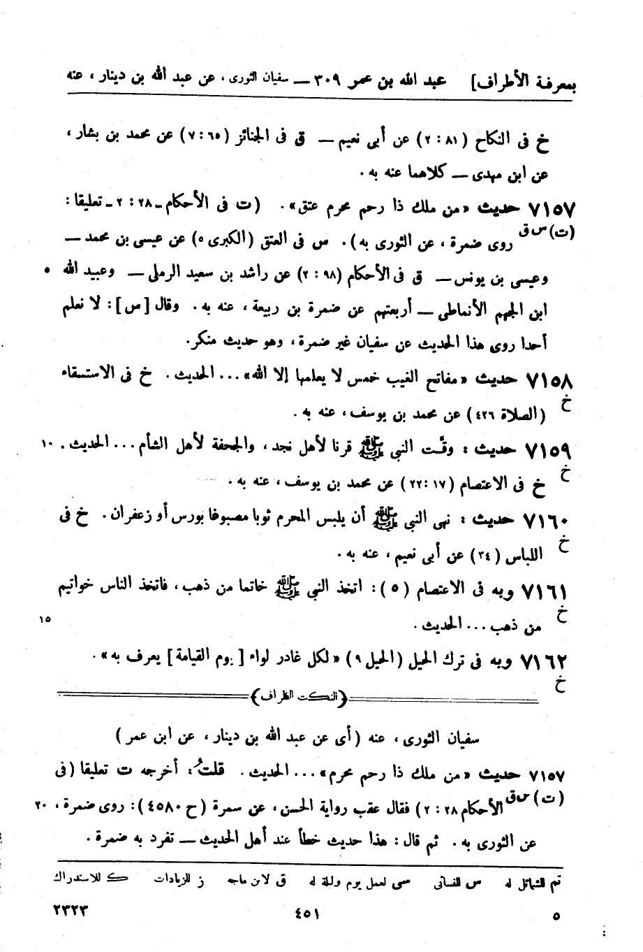 7157 -[ت س ق] حديث من ملك ذا رحم محرم عتق (ت في الأحكام - 28: 2 - تعليقاً: روى ضمرة عن الثوري به) س في العتق (الكبرى 5) عن عيسى بن محمد - وعيسى بن يونس - ق في الأحكام (98: 2) عن راشد بن سعيد الرملي - وعبيد الله بن الجهم الأنماطي - أربعتهم عن ضمرة بن ربيعة عنه به وقال [س] : لا نعلم أحداً روى هذا الحديث عن سفيان غير ضمرة وهو حديث منكر