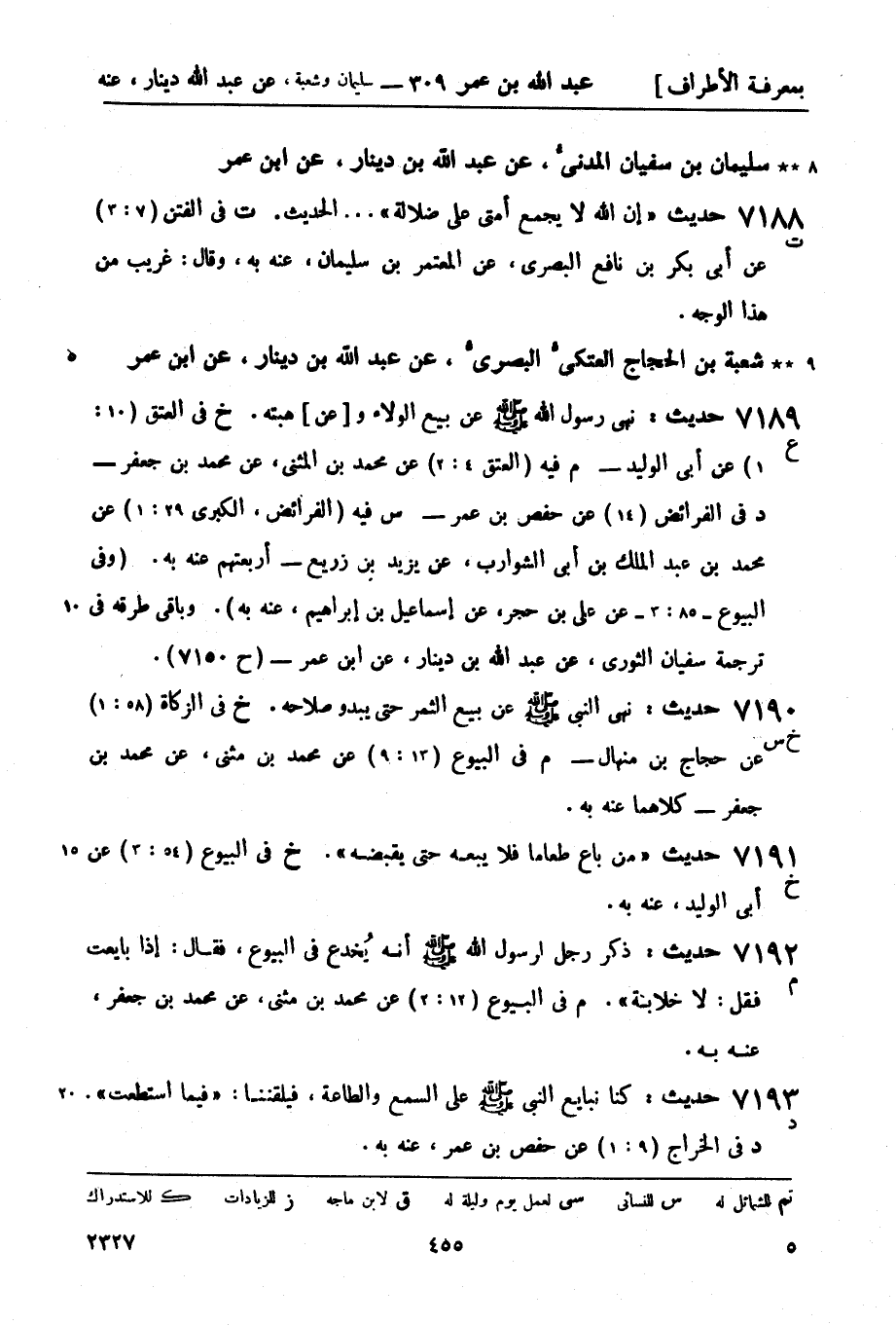 7189 -[ع] حديث: نهى رسول الله صَلَّى اللَّهُ عَلَيْهِ وَسَلَّمَ عن بيع الولاء و [عن] هبته خ في العتق (10: 1) عن أبي الوليد - م فيه (العتق 4: 2) عن محمد بن المثنى عن محمد بن جعفر - د في الفرائض (14) عن حفص بن عمر - س فيه (الفرائض، الكبرى 29: 1) عن محمد بن عبد الملك بن أبي الشوارب عن يزيد بن زريع - أربعتهم عنه به (وفي البيوع - 85: 3 - عن علي بن حجر عن إسماعيل بن إبراهيم عنه به) وباقي طرقه في ترجمة سفيان الثوري عن عبد الله بن دينار عن ابن عمر - (ح 7150)