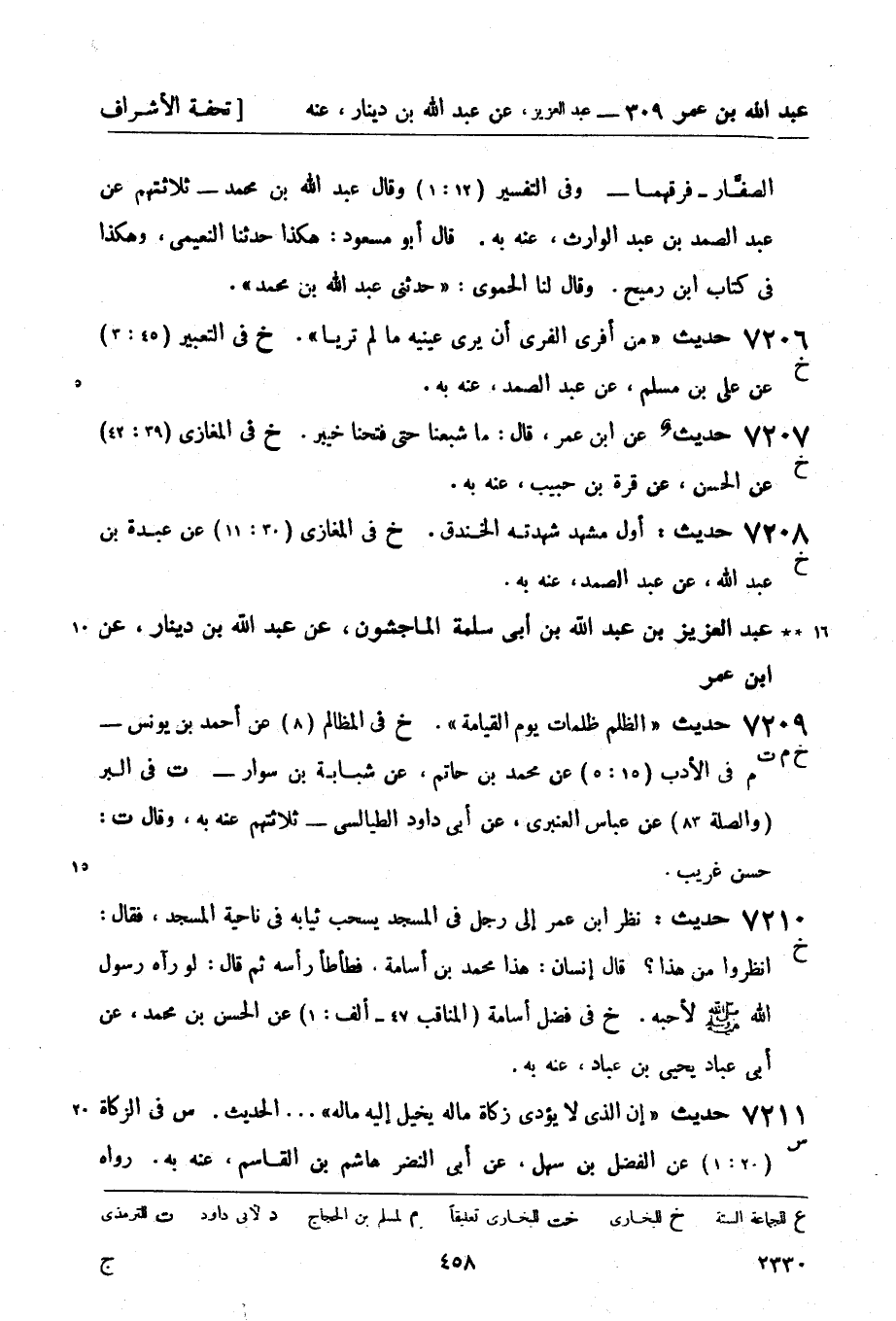 7209 -[خ م ت] حديث الظلم ظلمات يوم القيامة خ في المظالم (8) عن أحمد بن يونس - م في الأدب (15: 5) عن محمد بن حاتم عن شبابة بن سوار - ت في البر (والصلة 83) عن عباس العنبري عن أبي داود الطيالسي - ثلاثتهم عنه به وقال ت حسن غريب