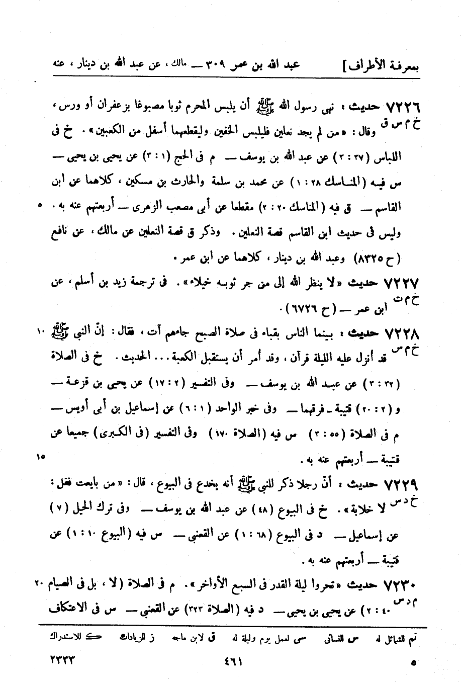7226 -[خ م س ق] حديث: نهى رسول الله صَلَّى اللَّهُ عَلَيْهِ وَسَلَّمَ أن يلبس المحرم ثوباً مصبوغاً بزعفران أو ورس وقال: من لم يجد نعلين فليلبس الخفين وليقطعهما أسفل من الكعبين خ في اللباس (37: 3) عن عبد الله بن يوسف - م في الحج (1: 3) عن يحيى بن يحيى - س فيه (المناسك 28: 1) عن محمد بن سلمة والحارث بن مسكين كلاهما عن ابن القاسم - ق فيه (المناسك 20: 2) مقطعاً عن أبي مصعب الزهري - أربعتهم عنه به. وليس في حديث ابن القاسم قصة النعلين وذكر ق قصة النعلين عن مالك عن نافع (ح 8325) وعبد الله بن دينار كلاهما عن ابن عمر