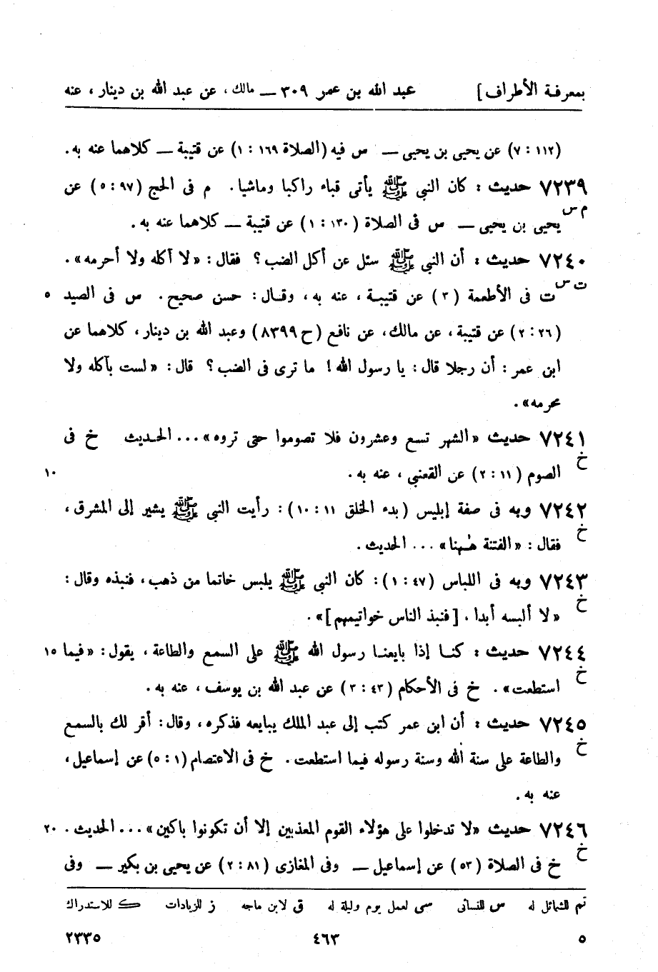 7240 -[ت س] حديث: أن النبي صَلَّى اللَّهُ عَلَيْهِ وَسَلَّمَ سئل عن أكل الضب؟ فقال: لا آكله ولا أحرمه ت في الأطعمة (3) عن قتيبة، عنه به وقال: حسن صحيح س في الصيد (26: 2) عن قتيبة عن مالك عن نافع (ح 8399) وعبد الله بن دينار كلاهما عن ابن عمر: أن رجلاً قال: يا رسول الله! ما ترى في الضب؟ قال: لست بآكله ولا محرمه