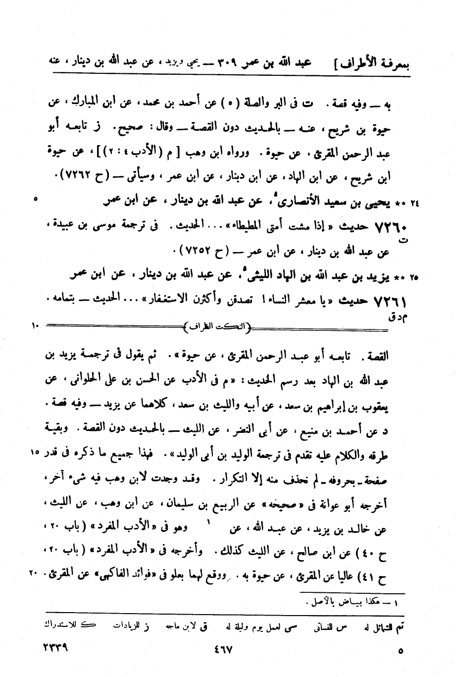 7261 -[م د ق] حديث يا معشر النساء تصدقن وأكثرن الاستغفار ... الحديث - بتمامه. -[468]- وفيه ما رأيت من ناقصات عقل ودين أغلب لذي لب منكن ... الحديث م في الإيمان (33: 1) عن محمد بن رمح عن الليث بن سعد - و (33: 1) عن أبي الطاهر بن السرح عن ابن وهب عن بكر بن مضر - كلاهما عنه به. د في السنَّة (16: 1) عن أبي الطاهر - ببعضه: ما رأيت [من] ناقصات عقل ولا دين ... الحديث ق في الزهد (لا، بل في الفتن 19: 6) عن محمد بن رمح - بتمامه.