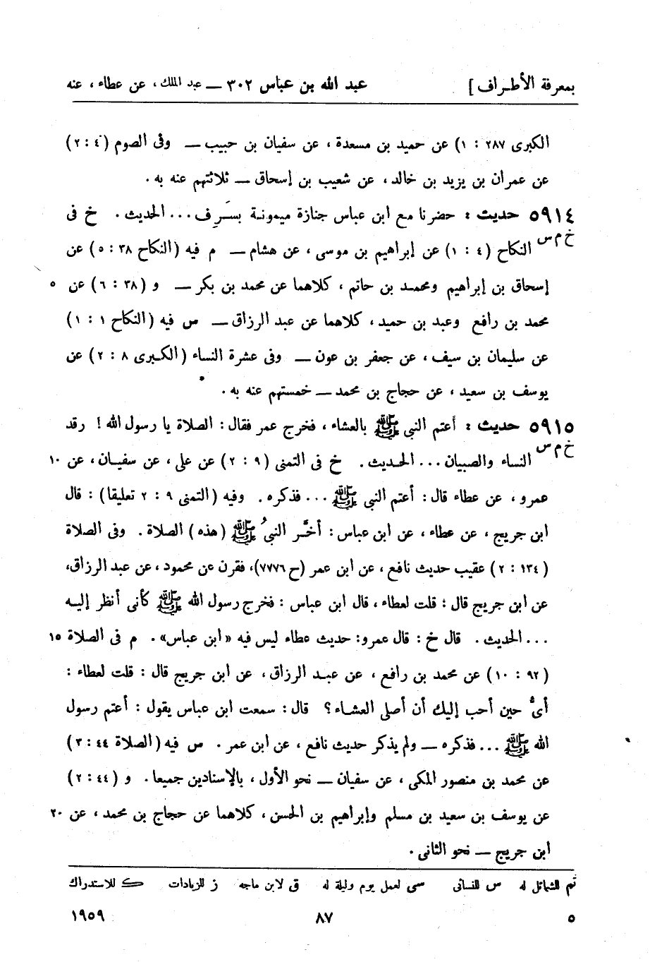 5915 - (خ م س) حديث: أعتم النبي - صلى الله عليه وسلم - بالعشاء، فخرج عمر فقال: الصلاة يا رسول الله رقد النساء والصبيان ... الحديث. خ في التمني (9: 2) عن علي، عن سفيان، عن عمرو، عن عطاء قال: أعتم النبيّ صَلَّى اللَّهُ عَلَيْهِ وَسَلَّمَ ... فذكره. وفيه (التمني 9: 2 تعليقاً) : قال ابن جريج، عن عطاء، عن ابن عباس: أخَّر النبيُ (هذه) الصلاة. وفي الصلاة (134: 2) عقيب حديث نافع، عن ابن عمر (ح 7776) ، فقرن عن محمود، عن عبد الرزاق، عن ابن جريج قال: قلت لعطاء، قال ابن عباس: فخرج رسول الله كأني أنظر إليه ... الحديث. قال خ: قال عمرو: حديث عطاء ليس فيه ابن عباس. م في الصلاة (92: 10) عن محمد بن رافع، عن عبد الرزاق، عن ابن جريج قال: قلت لعطاء: أيُّ حين أحب إليك أن أصلي العشاء؟ قال: سمعت ابن عباس يقول: أعتم رسول الله صَلَّى اللَّهُ عَلَيْهِ وَسَلَّمَ ... فذكره ولم يذكر حديث نافع، عن ابن عمر. س فيه (الصلاة 44: 3) عن محمد بن منصور المكي، عن سفيان نحو الأول، بالإسنادين جميعاً. و (44: 2) عن يوسف بن سعيد بن مسلم وإبراهيم بن الحسن، كلاهما عن حجاج بن محمد، عن ابن جريج نحو الثاني.