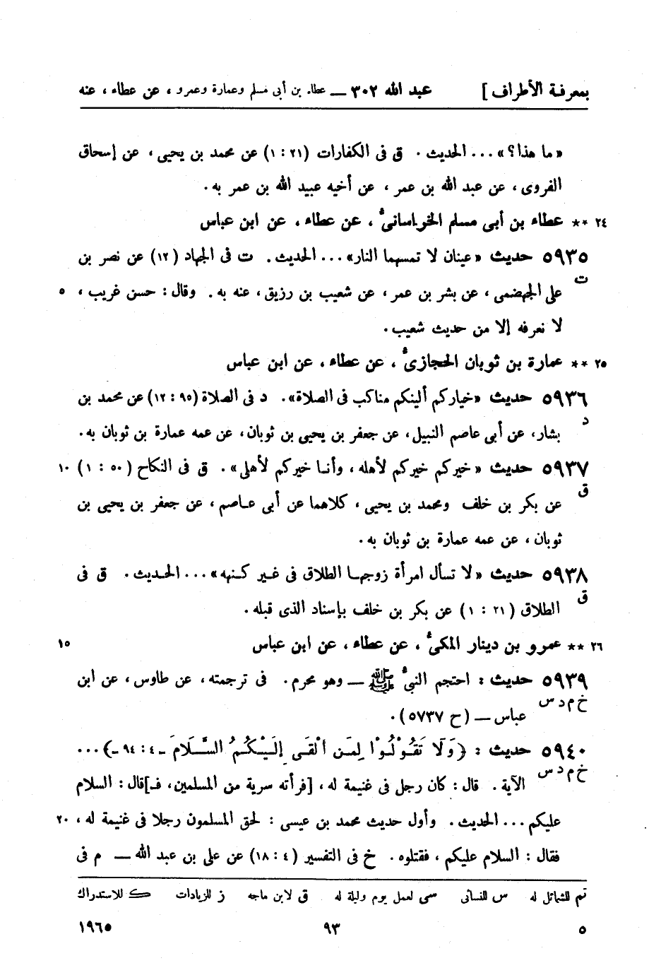 5940 - (خ م د س) حديث: وَلا تَقُوْلُوْا لِمَنْ ألْقَى إلَيْكُمُ السَّلامَ 4: 94} ... الآية. قال: كان رجل في غنيمة له. (فرأته سرية من المسلمين، فـ) قال: السلام عليكم ... الحديث. وأول حديث محمد بن عيسى: لحق المسلمون رجلاً في غنيمة له، فقال: السلام عليكم، فقتلوه. خ في التفسير (4: 18) عن علي بن عبد الله م في -[94]- آخر الكتاب (التفسير 1: 26) عن أبي بكر بن أبي شيبة وإسحاق بن إبراهيم وأحمد بن عبدة د في الحروف (6) عن محمد بن عيسى س في السير (الكبرى 8) وفي التفسير (في الكبرى) عن محمد بن عبد الله بن يزيد ستتهم عن سفيان بن عيينة، عنه به.