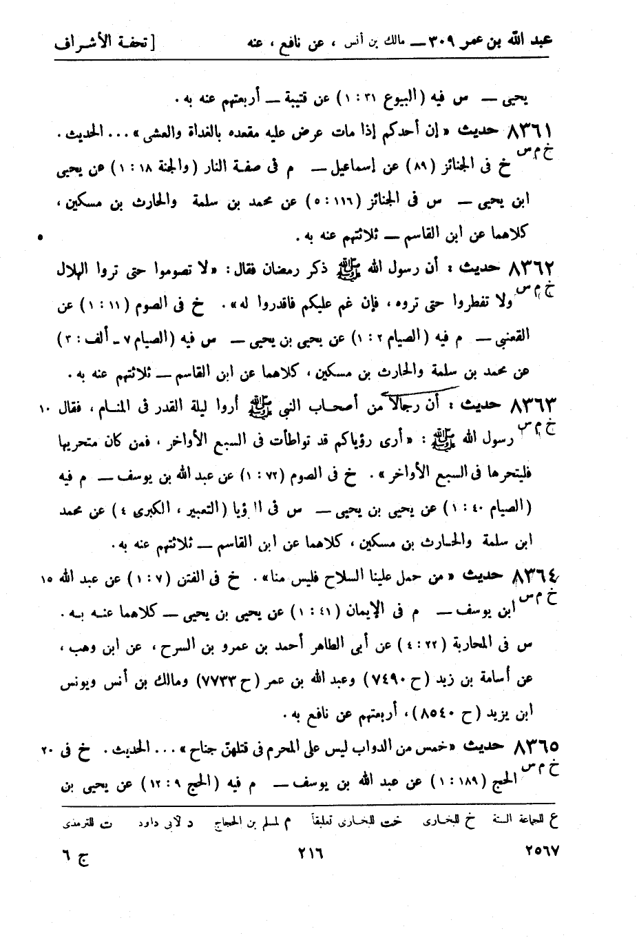 س فيه (المناسك 82) عن قُتَيْبَة - ثلاثتهم عنه بِهِ. وفي حديث عبد الله بن يوسف: عن مالك، عن نافع وعبد الله بن دينار (ح 7247) ، كلاهما عن ابن عمر (ز) رواه سالم بن عبد الله بن عمر، عن أبيه، عن حفصة - (ح 15804) . ورَواهُ زيد بن جبير، عن ابن عمر، عن إحدى نسوة النبيّ صَلَّى اللَّهُ عَلَيْهِ وَسَلَّمَ، وسياتي - (ح 18373) .