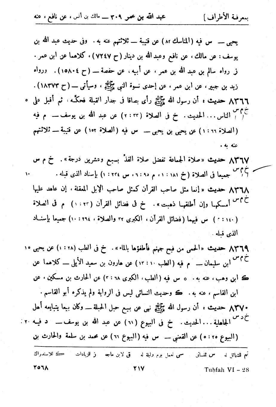 8367 -[خ م س] حديث صلاة الجماعة تفضل صلاة الفذِّ بسبع وعشرين درجة. (خ م س) جميعًا في الصلاة (خ 181: 1، م 95: 6، س 234: 1) بإسناد الذي قبله.