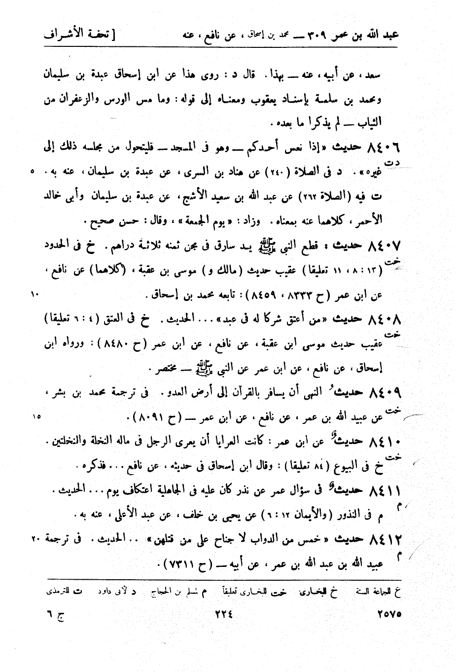 8407 -[خت] حديث: قطع النبي صَلَّى اللَّهُ عَلَيْهِ وَسَلَّمَ يد سارق في مجن ثمنه ثلاثة دراهم. (خ) في الحدود (13: 8، 11 تعليقًا) عقيب حديث (مالك و) موسى بن عقبة، (كلاهما) عن نافع، عن ابن عمر (ح 8333، 8459) : تابعه محمد بن إسحاق.