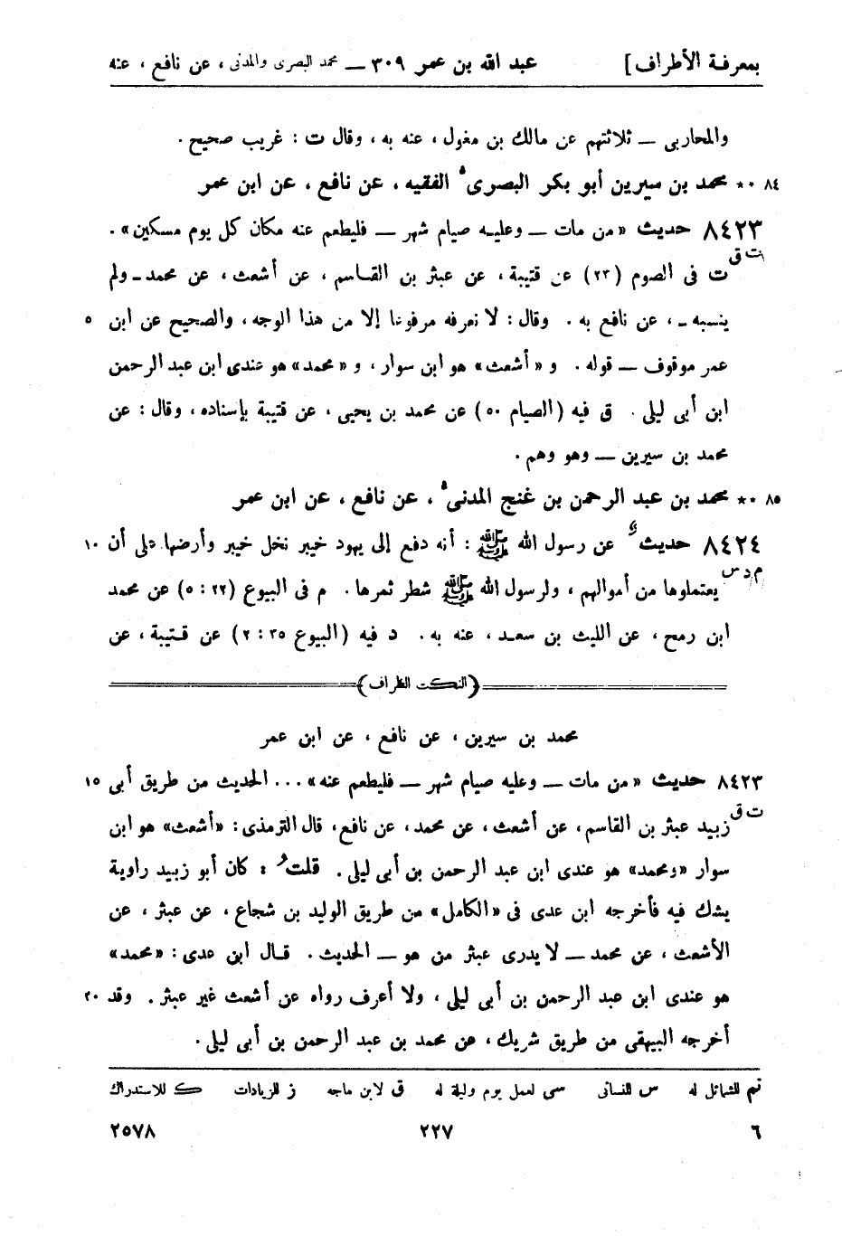 8423 -[ت ق] حديث من مات - وعليه صيام شهر - فليطعم عنه مكان كل يوم مسكين. (ت) في الصوم (23) عن قُتَيْبَة، عن عبثر بن القاسم، عن أشعث، عن محمد - ولم ينسبه -، عن نافع بِهِ. وقال: لا نعرفه مرفوعًا إلا من هذا الوجه، والصحيح عن ابن عمر موقوف - قوله. وأشعث هو ابن سوار، ومحمد هو عندي ابن عبد الرحمن بن أبي ليلى.