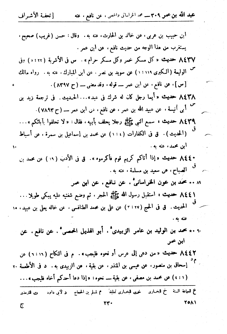 8437 -[س] حديث كل مسكر خمر وكل مسكر حرام. (س) في الأشربة (22: 5) وفي الوليمة (الكبرى 119: 1) عن سويد بن نصر، عن ابن المبارك، عنه بِهِ. رواه مالك [س] ، عن نافع، عن ابن عمر - قوله، وقد مضى - (ح 8397) .