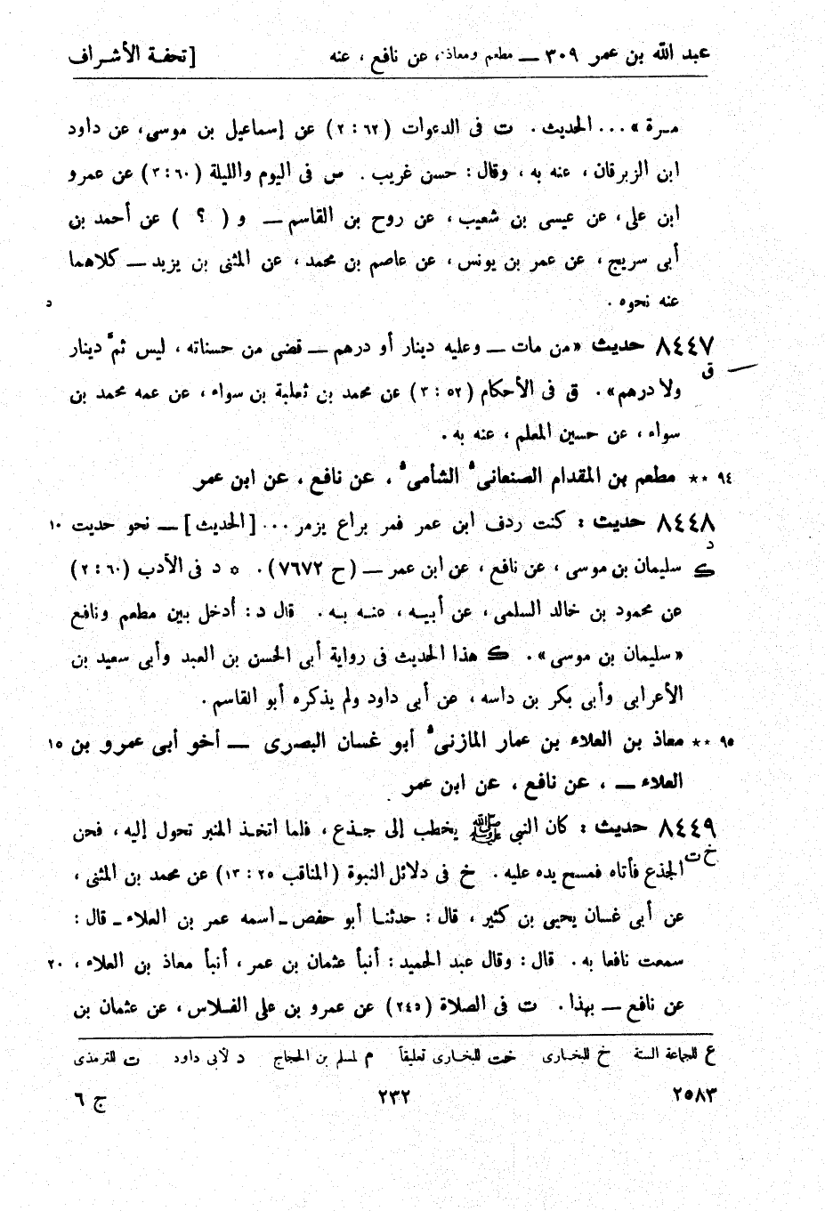 8449 -[خ ت] حديث: كان النَّبِيّ صَلَّى اللَّهُ عَلَيْهِ وَسَلَّمَ يخطب إلى جذع، فلما اتخذ المنبر تحول إليه، فحن الجذع فأتاه فمسح يده عليه. (خ) في دلائل النبوة (المناقب 25: 13) عن محمد بن المثنى، عن أبي غسان يحيى بن كثير، قال: حدثنا أبو حفص - اسمه عمر بن العلاء - قال: سمعت نافعًا بِهِ. قال: وقال عبد الحميد: أنبأ عثمان بن عمر، أنبأ معاذ بن العلاء، [20] عن نافع - بهذا.