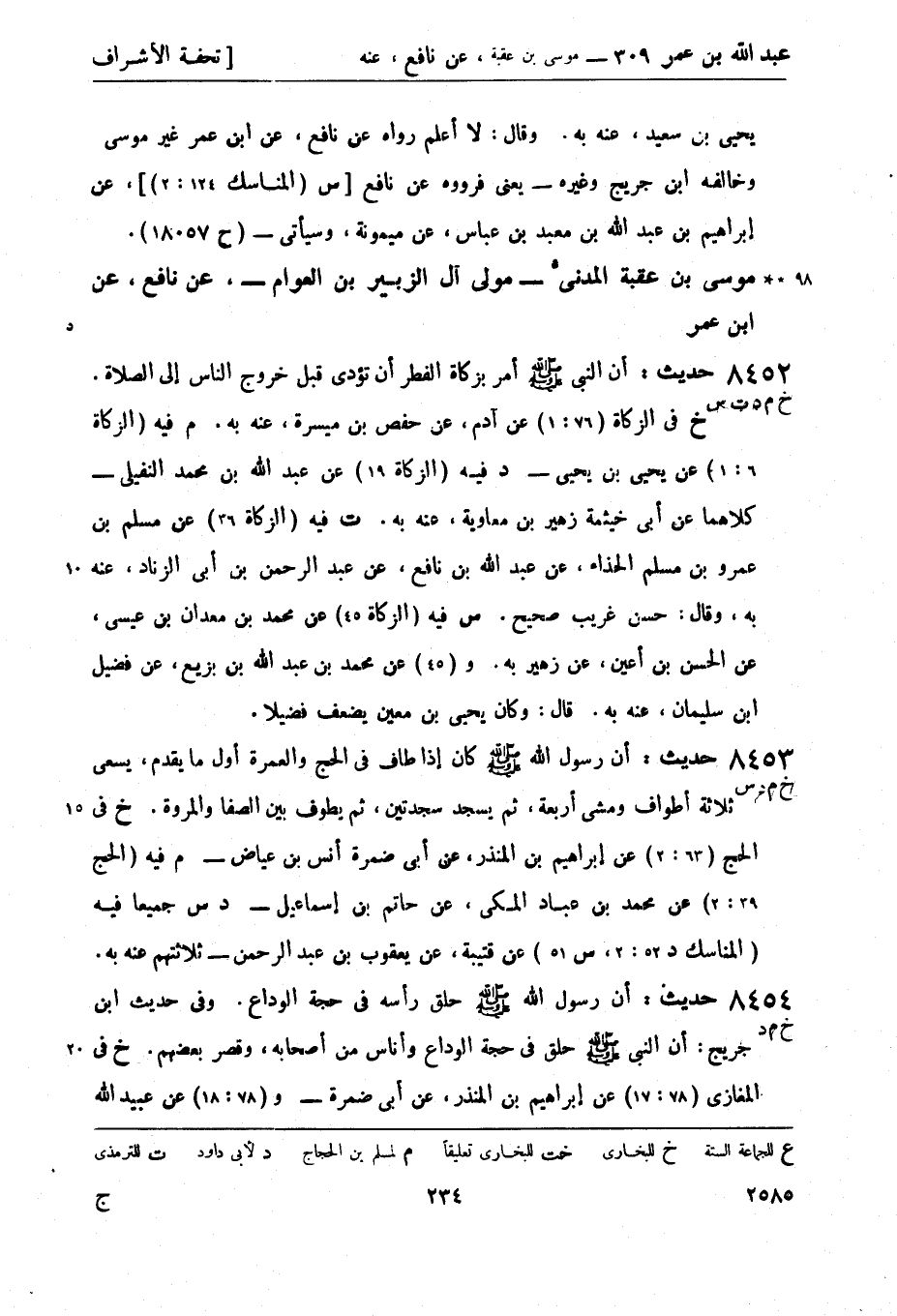 8452 -[خ م د ت س] حديث: أن النَّبِيّ صَلَّى اللَّهُ عَلَيْهِ وَسَلَّمَ أمر بزكاة الفطر أن تؤدي قبل خروج الناس إلى الصلاة. (خ) في الزكاة (76: 1) عن آدم، عن حفص بن ميسرة، عنه بِهِ.