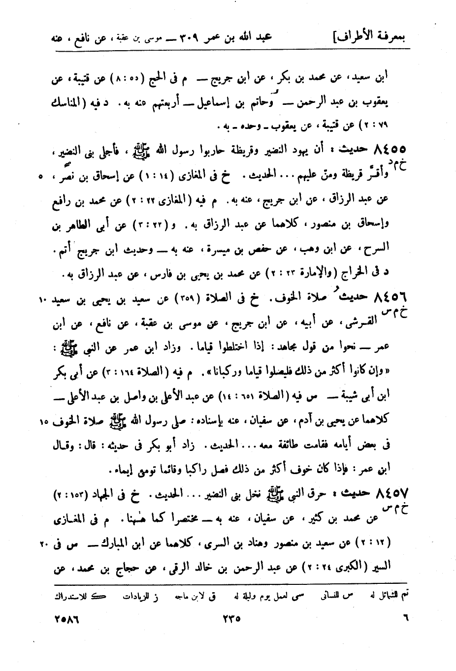 8456 -[خ م س] حديث صلاة الخوف. (خ) في الصلاة (359) عن سعيد بن يحيى بن سعيد القرشي، عن أبيه، عن ابن جريج، عن موسى بن عقبة، عن نافع، عن ابن عمر - نحوًا من قول مجاهد: إذا اختلطوا قيامًا. وزاد ابن عمر عن النبيّ صَلَّى اللَّهُ عَلَيْهِ وَسَلَّمَ: وإن كانوا أكثر من ذلك فليصلوا قيامًا وركبانًا.