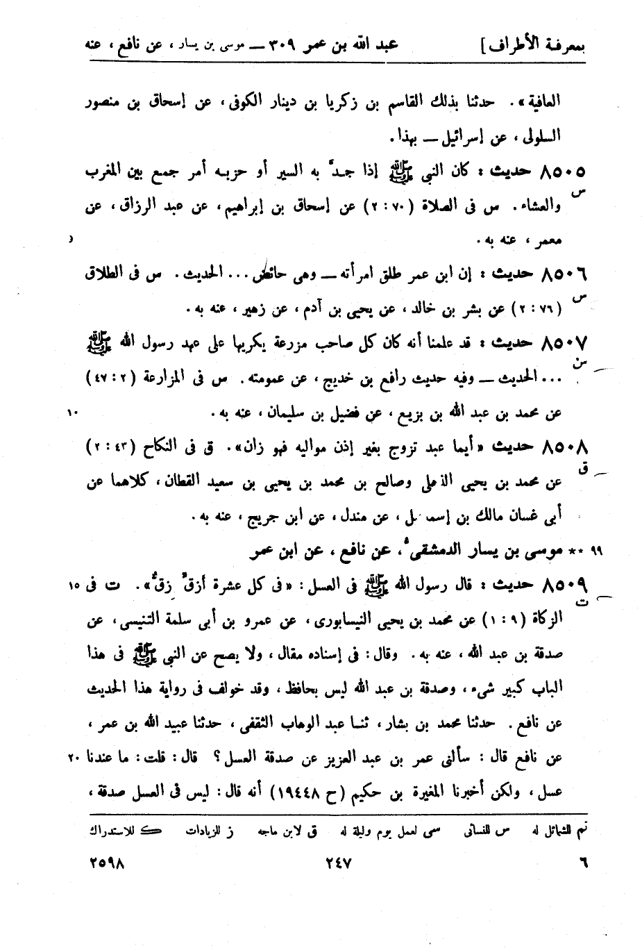 8509 -[ت] حديث: قال رسول الله صَلَّى اللَّهُ عَلَيْهِ وَسَلَّمَ في العسل: في كل عشرة أزقَ زِقٌّ. (ت) في الزكاة (9: 1) عن محمد بن يحيى النيسابوري، عن عمرو بن أبي سلمة التنيسي، عن صدقة بن عبد الله، عنه بِهِ. وقال: في إسناده مقال، ولا يصح عن النَّبِيّ صَلَّى اللَّهُ عَلَيْهِ وَسَلَّمَ في هذا الباب كبير شيء، وصدقة بن عبد الله ليس بحافظ، وقد خولف في رواية هذا الحديث عن نافع. حدثنا محمد بن بشار، ثنا عبد الوهاب الثقفي، حدثنا عُبَيد الله بن عمر، عن نافع قال: سألني عمر بن عبد العزيز عن صدقة العسل؟ قال: قلت: ما عندنا عسل، ولكن أخبرنا المغيرة بن حكيم (19448) أنه قال: ليس في العسل صدقة، -[248]- فقال (عمر) : عدل مرضى، فكتب إلى الناس أن توضع - يعني عنهم1.