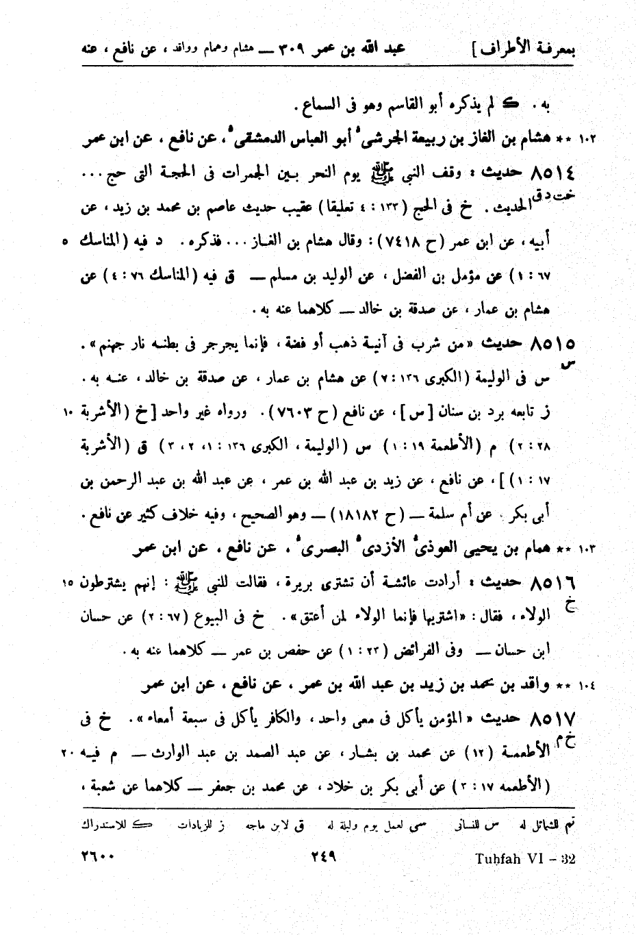 8514 - (خت د ق) حديث: وقف النَّبِيّ صَلَّى اللَّهُ عَلَيْهِ وَسَلَّمَ يوم النحر بين الجمرات في الحجة التي حج.... الحديث. (خ) في الحج (133: 4 تعليقًا) عقيب حديث عاصم بن محمد بن زيد، عن أبيه، عن ابن عمر (ح 7418) : وقال هشام بن الغاز ... فذكره. (د) فيه (المناسك 67: 1) عن مؤمل بن الفضل، عن الوليد بن مسلم - (ق) فيه (المناسك 76: 4) عن هشام عن عمار، عن صدقة بن خالد - كلاهما عنه به.