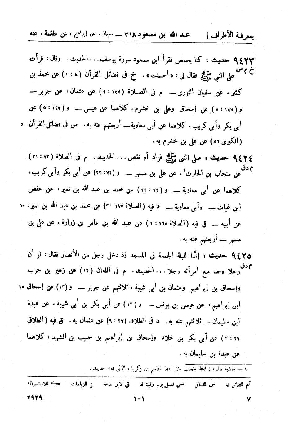 9423 -[خ م س] حديث: كنا بحمص فقرأ ابن مسعود سورة يوسف ... الحديث. وقال: قرأت على النبيّ صَلَّى اللَّهُ عَلَيْهِ وَسَلَّمَ فقال لي: أحسنت.