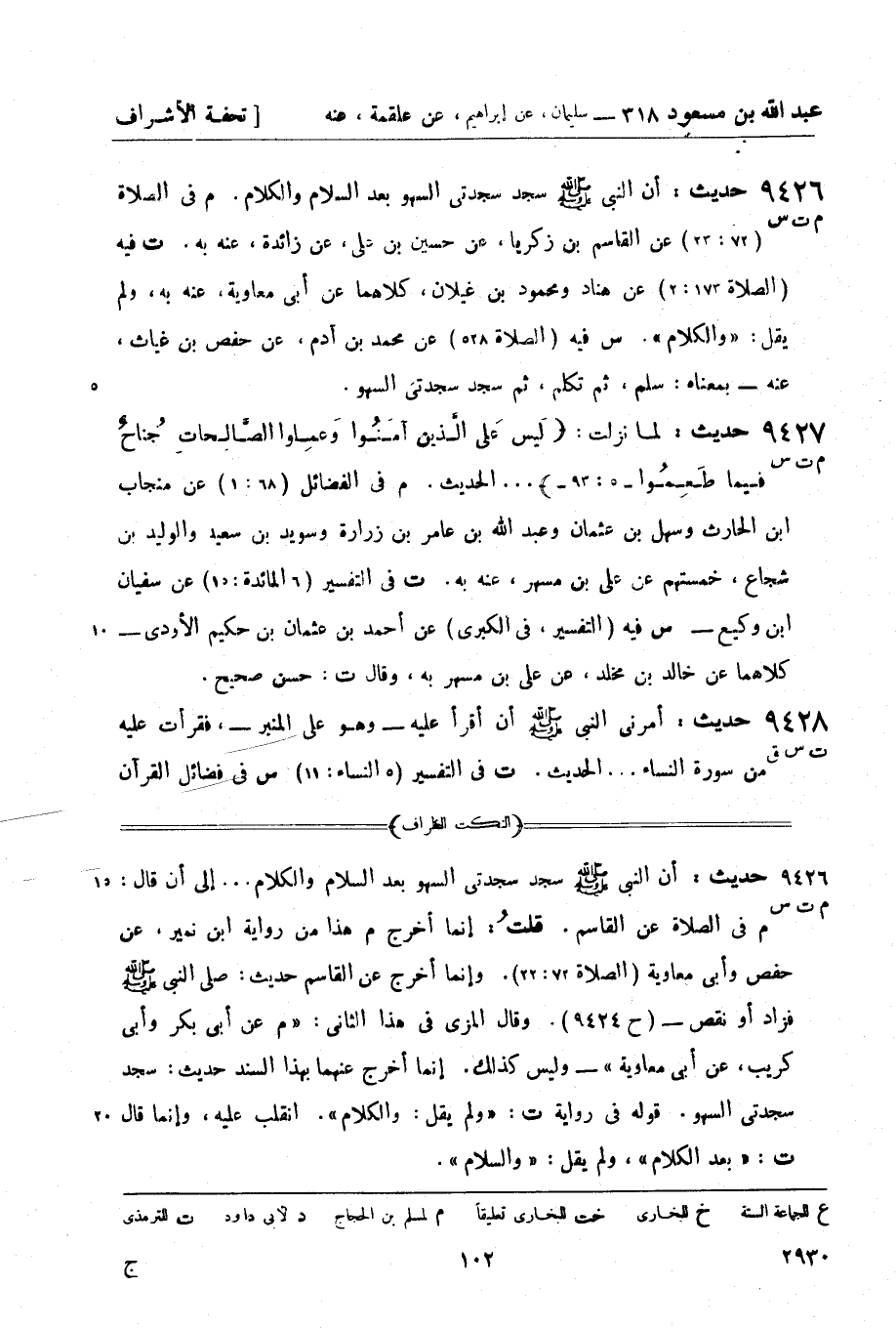 9426 -[م ت س] حديث: أن النبيّ صَلَّى اللَّهُ عَلَيْهِ وَسَلَّمَ سجد سجدتي السهو بعد السلام والكلام. (م) في الصلاة (72: 23) عن القاسم بن زكريا , عن حسين بن علي , عن زائدة , عنه به.