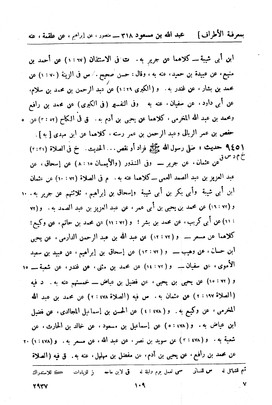 م في الصلاة (72: 10) عن عثمان بن أبي شيبة وأبي بكر بن أبي شيبة وإسحاق بن إبراهيم , ثلاثتهم عن جرير به. و (72: 16) عن محمد بن يحيى بن أبي عمر , عن عبد العزيز بن عبد الصمد به. و (72: 11) عن أبي كريب , عن محمد بن بشر؛ و (72: 11) عن محمد بن حاتم , عن وكيع , كلاهما عن مسعر - و (72: 12) عن عبد الله بن عبد الرحمن الدارمي , عن يحيى بن حسان , عن وهيب - و (72: 13) عن إسحاق بن إبراهيم , عن عبيد بن سعيد الأموي , عن سفيان - و (72: 14) عن محمد بن مثنى , عن غندر , عن شعبة - و (72: 15) عن يحيى بن يحيى , عن فضيل بن عياض - خمستهم عنه به.