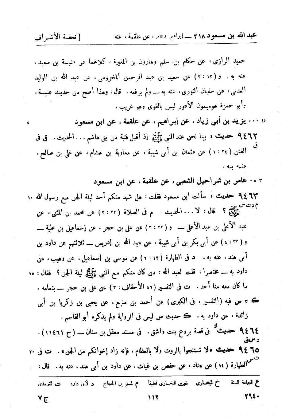 9463 -[م د ت س] حديث: سألت ابن مسعود فقلت: هل شهد منكم أحد ليلة الجن مع رسول الله صَلَّى اللَّهُ عَلَيْهِ وَسَلَّمَ؟ قال: لا ... الحديث.