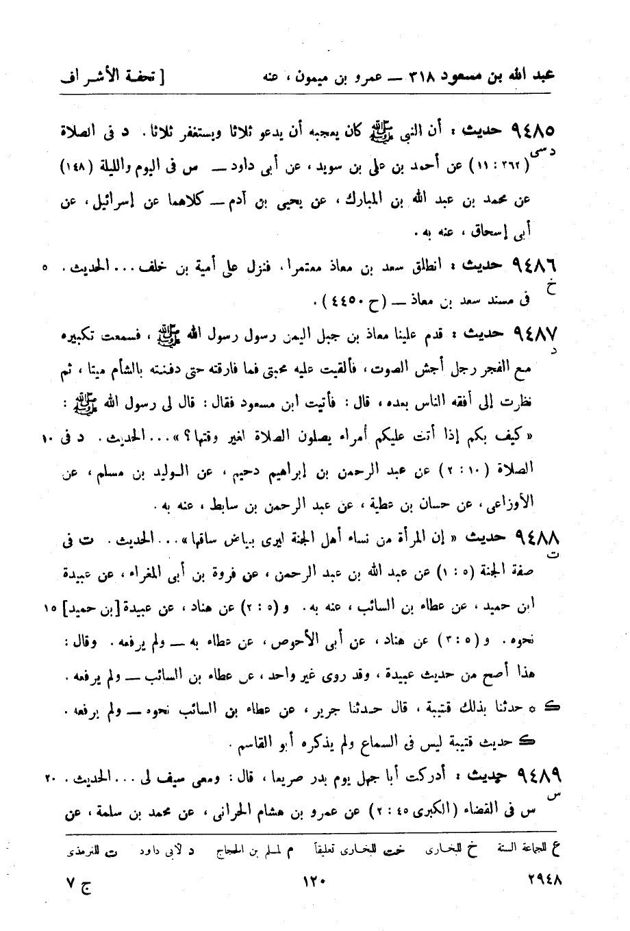 ت في صفة الجنة (5: 1) عن عبد الله بن عبد الرحمن , عن فروة بن أبي المغراء , عن عبيدة بن حميد , عن عطاء بن السائب , عنه به. و (5: 2) عن هناد , عن عبيدة [بن حميد] نحوه. و (5: 3) عن هناد , عن أبي الأحوص , عن عطاء به - ولم يرفعه. وقال: هذا أصح من حديث عبيدة , وقد روى غير واحد , عن عطاء بن السائب - ولم يرفعه. (ك) حدثنا بذلك قتيبة , قال: حدثنا جرير , عن عطاء بن السائب نحوه - ولم يرفعه. (ك) حديث قتيبة ليس في السماع ولم يذكره أبو القاسم.