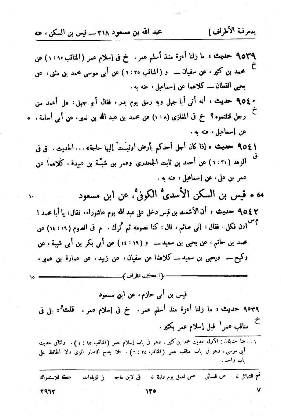 9539 -[خ] حديث: مازلنا أعزة منذ أسلم عمر. (خ) في إسلام عمر (المناقب 95: 1) عن محمد بن كثير , عن سفيان - و (المناقب 35: 6) عن أبي موسى محمد بن مثنى , عن يحيى القطان - كلاهما عن إسماعيل , عنه به.