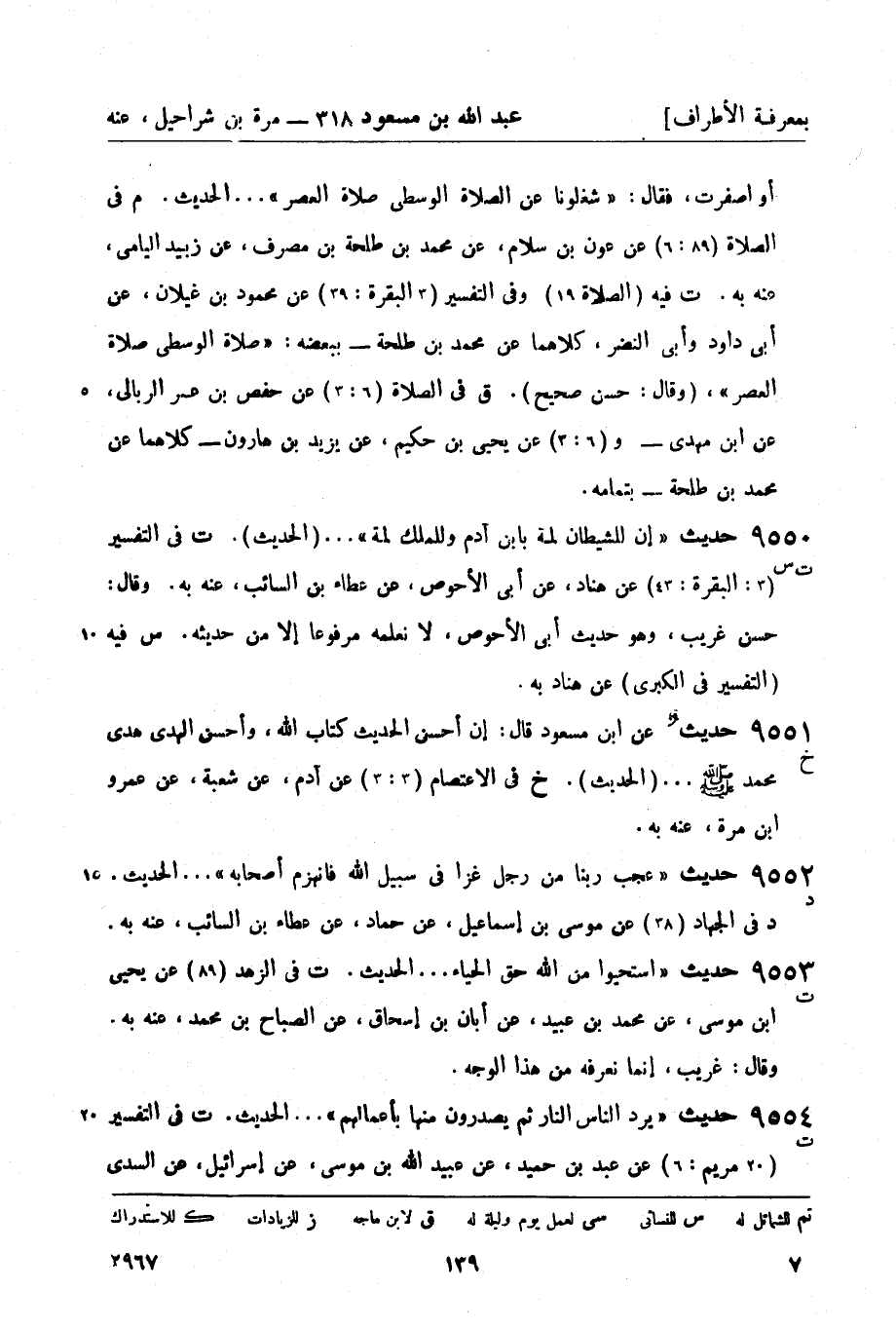 ت في التفسير (20 مريم: 6) عن عبد بن حميد , عن عبيد الله بن موسى , عن إسرائيل , عن السدي -[140]- قال: سألت مرة الهمداني , عن قول الله تعالى: وَإنْ مِنكُم إِلاَّ واردُها (19: 71) ؟ فحدثني ... فذكره. و (20 مريم: 7) عن ابن بشار , عن يحيى؛ و (20 مريم: 8) عبد الرحمن - فرقهما -؛ كلاهما عن شعبة , عن السدي، عن مرة - موقوف. قال عبد الرحمن: قلت لشعبة: إن إسرائيل حدثني عن السدي، عن مرة , عن عبد الله , عن النبيّ صَلَّى اللَّهُ عَلَيْهِ وَسَلَّمَ. قال شعبة: وقد سمعته من السدي مرفوعاً ولكن عمداً أدعه.