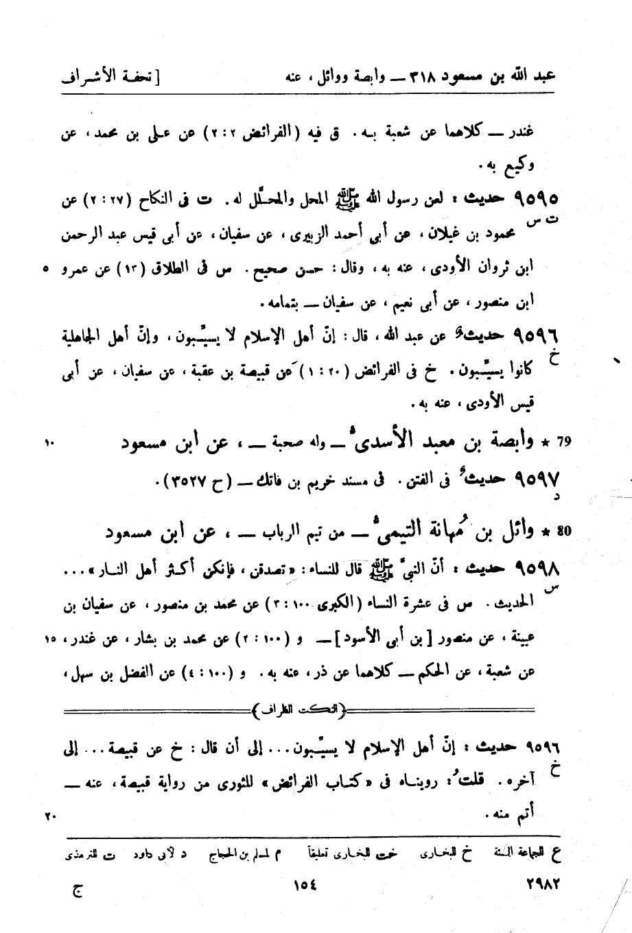 9596 -[خ] حديثٌ عن عبد الله، قال: إنّ أهل الإسلام لا يسيِّبون، وإنّ أهل الجاهلية كانوا يسيِّبون. (خ) في الفرائض (20: 1) عن قبيصة بن عقبة، عن سفيان , عن أبي قيس الأودي، عنه به.