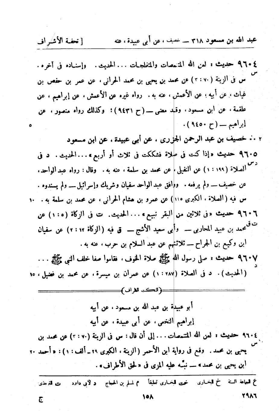 س في الزينة (70: 3) عن محمد بن يحيى بن محمد الحراني، عن عمر بن حفص بن غياث، عن أبيه، عن الأعمش , عنه به. رواه غيره عن الأعمش، عن إبراهيم، عن علقمة، عن ابن مسعود، وقد مضى - (ح 9431) ؛ وكذلك رواه منصور، عن إبراهيم - (ح 9450) .