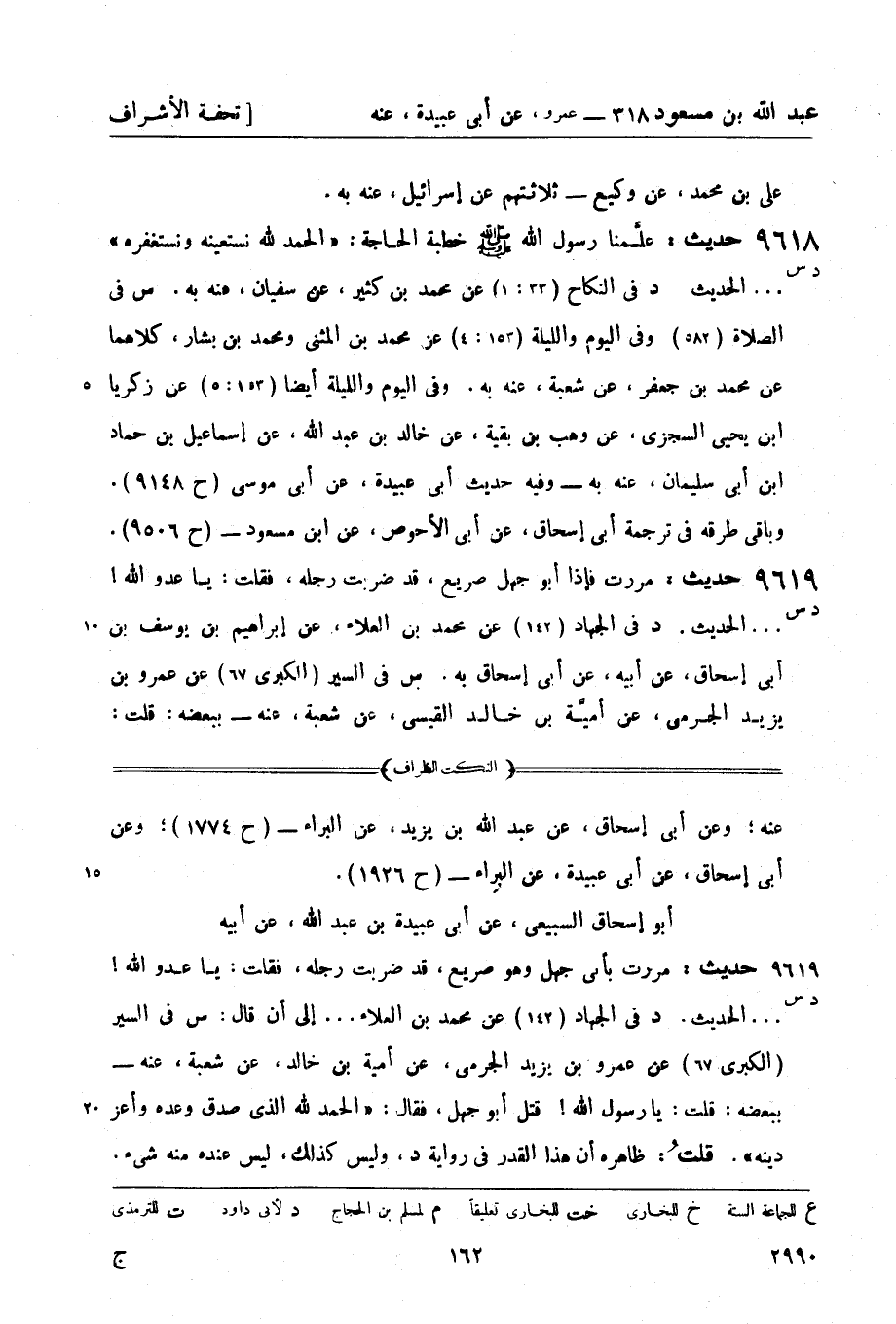 س في الصلاة (582) وفي اليوم والليلة (153: 4) عن محمد بن المثنى ومحمد بن بشار، كلاهما عن محمد بن جعفر، عن شعبة , عنه به. وفي اليوم والليلة أيضاً (153: 5) عن زكريا بن يحيى السجزي، عن وهب بن بقية، عن خالد بن عبد الله، عن إسماعيل بن حماد بن أبي سليمان , عنه به - وفيه حديث أبي عبيدة، عن أبي موسى (ح 9148) . وباقي طرقه في ترجمة أبي إسحاق، عن أبي الأحوص، عن ابن مسعود - (ح 9506) .