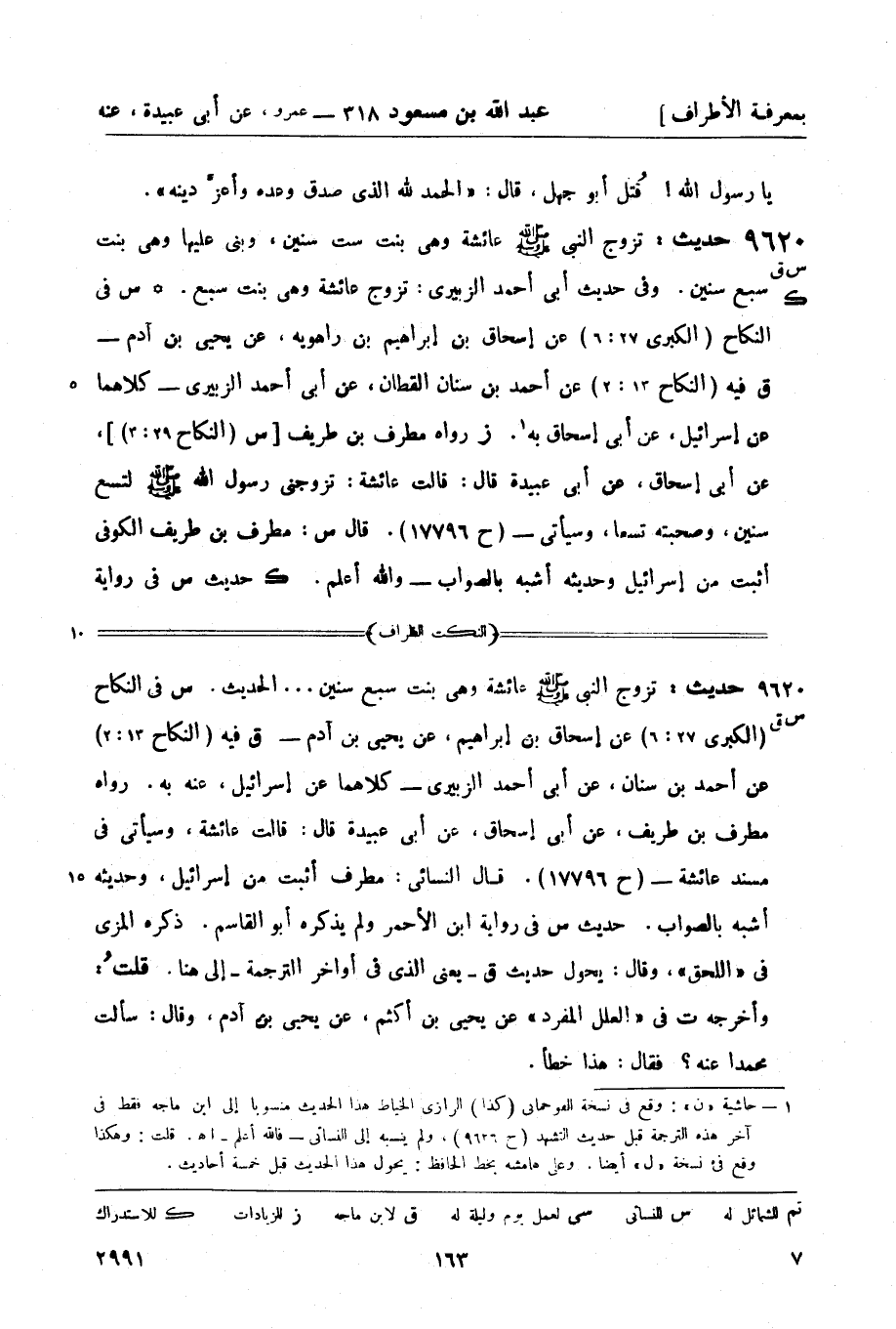 ق فيه (النكاح 13: 2) عن أحمد بن سنان القطان، عن أبي أحمد الزبيري - كلاهما عن إسرائيل، عن أبي إسحاق به1. (ز) رواه مطرف بن طريف [س (النكاح 29: 3) ] ، عن أبي إسحاق، عن أبي عبيدة قال: قالت عائشة: تزوجني رسول الله صَلَّى اللَّهُ عَلَيْهِ وَسَلَّمَ لتسع سنين، وصحبته تسعاً، وسيأتي - (ح 17796) . قال